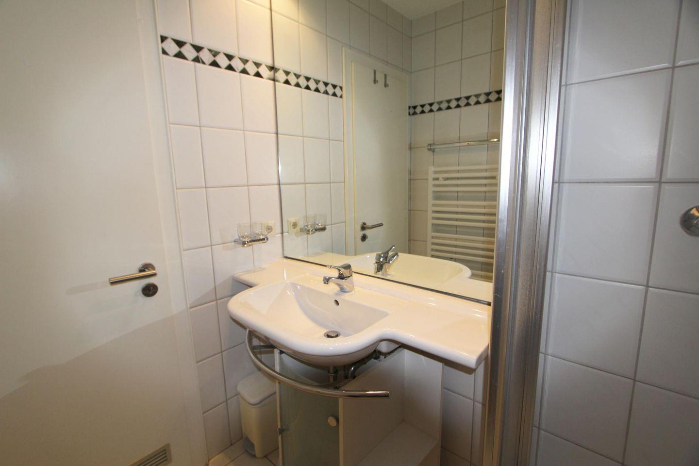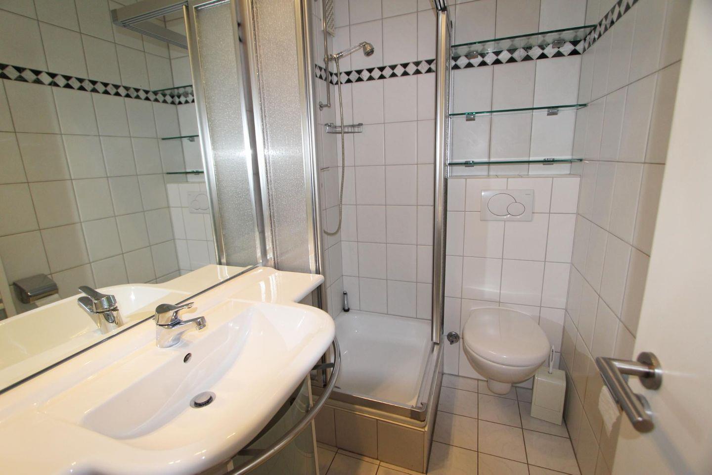 Ferner verfügt das Appartement über ein hell gefliestes Badezimmer mit Dusche und WC.