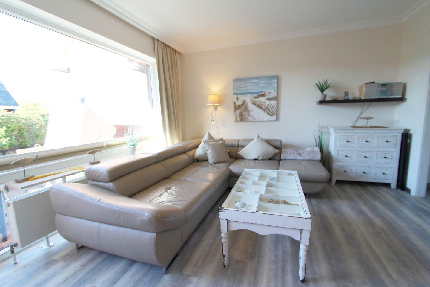 Treten Sie in den Wohnbereich ein und spüren sofort die Entspannung! Warme Töne und maritime Details verleihen dem Raum im Erdgeschoss ein herausragendes Ambiente.