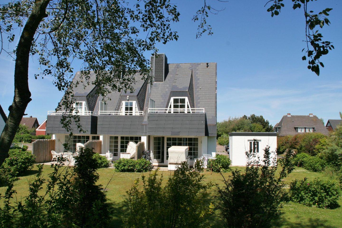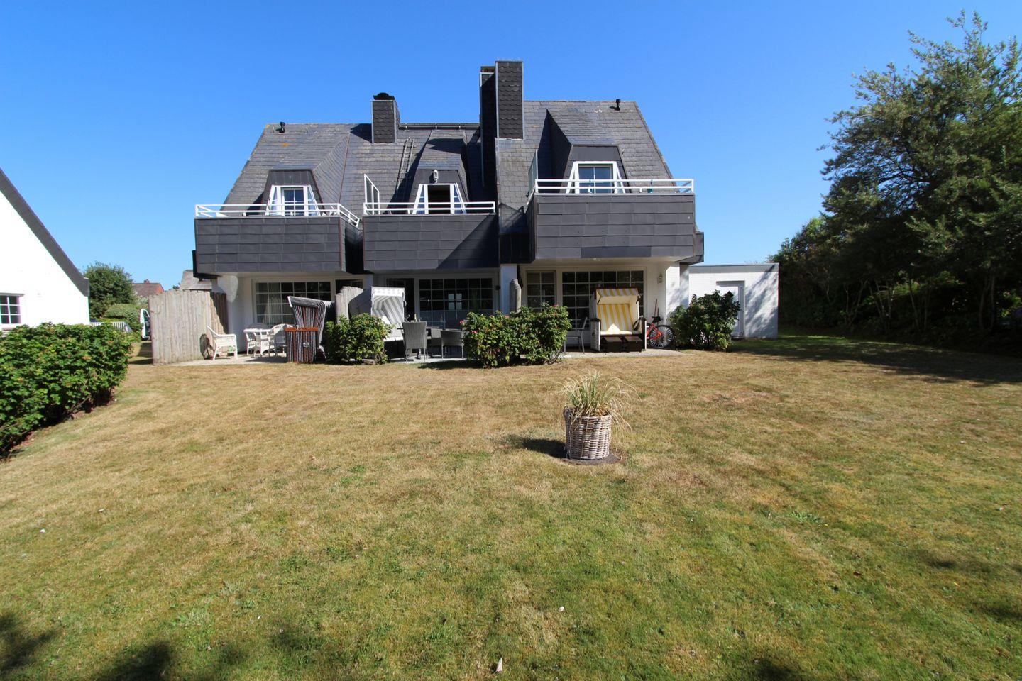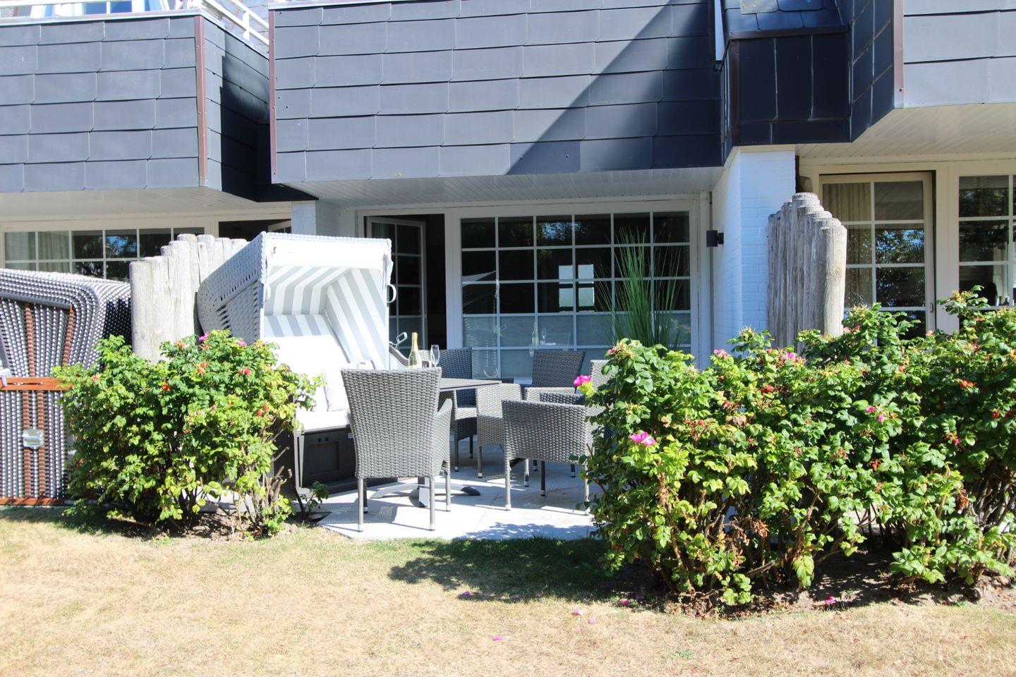 Die idyllische, teilweise überdachte Terrasse mit Südausrichtung bietet den optimalen Erholungsfaktor. Entspannen Sie im eigenen Strandkorb (April bis Oktober) und den geschmackvollen Gartenmöbeln in der Sylter Sonne.