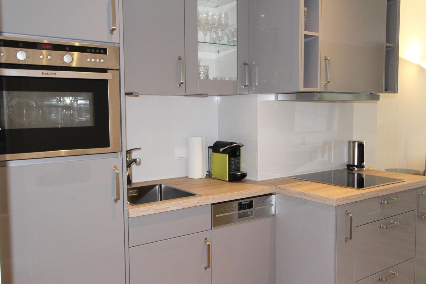 In dem offenen Küchenbereich können Sie dank hochwertigster Ausstattung nach Herzenslust kochen und Ihr Lieblingsgetränk zubereiten. Auch ein Weinkühlschrank ist vorhanden. Der gemütliche Essensplatz grenzt an den Wohnbereich an und ist sehr stilvoll gestaltet.