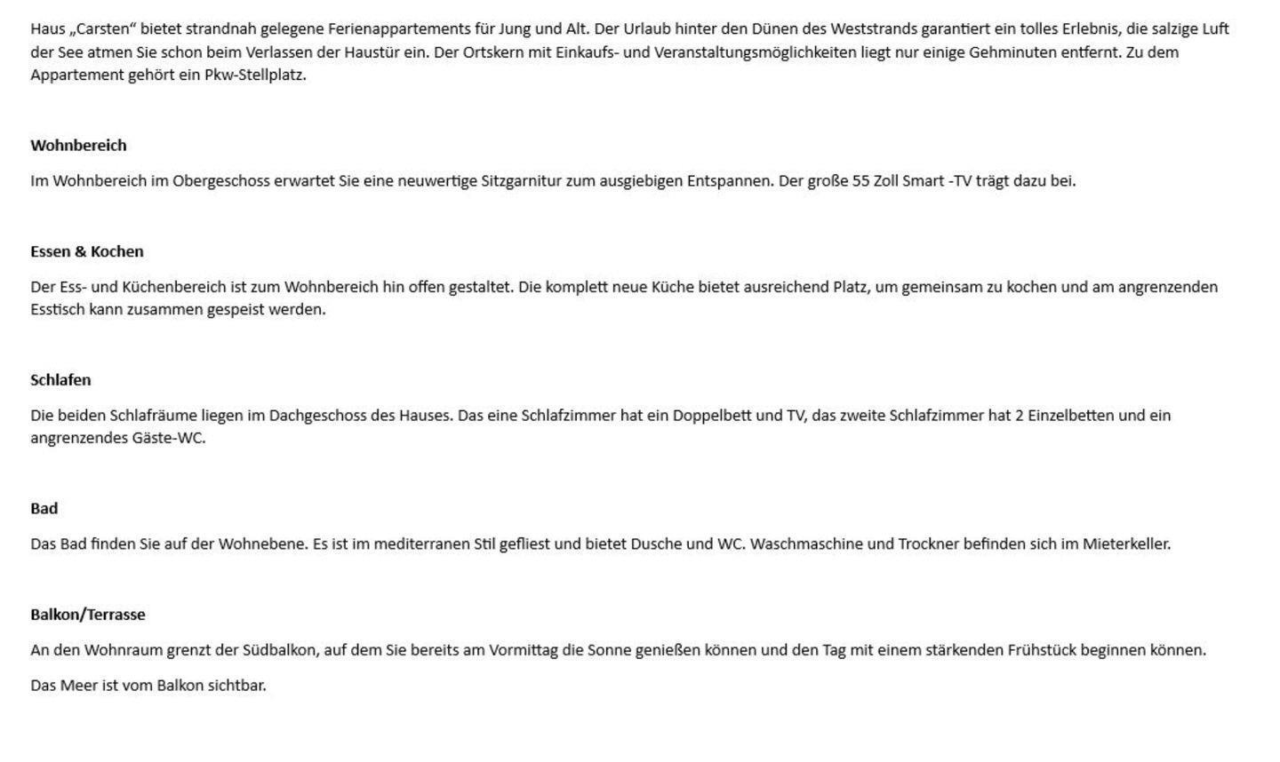 Haus „Carsten“ bietet strandnah gelegene Ferienappartements für Jung und Alt. Der Urlaub hinter den Dünen des Weststrands garantiert ein tolles Erlebnis, die salzige Luft der See atmen Sie schon beim Verlassen der Haustür ein. Der Ortskern mit Einkaufs- und Veranstaltungsmöglichkeiten liegt nur einige Gehminuten entfernt. Zu dem Appartement gehört ein Pkw-Stellplatz.