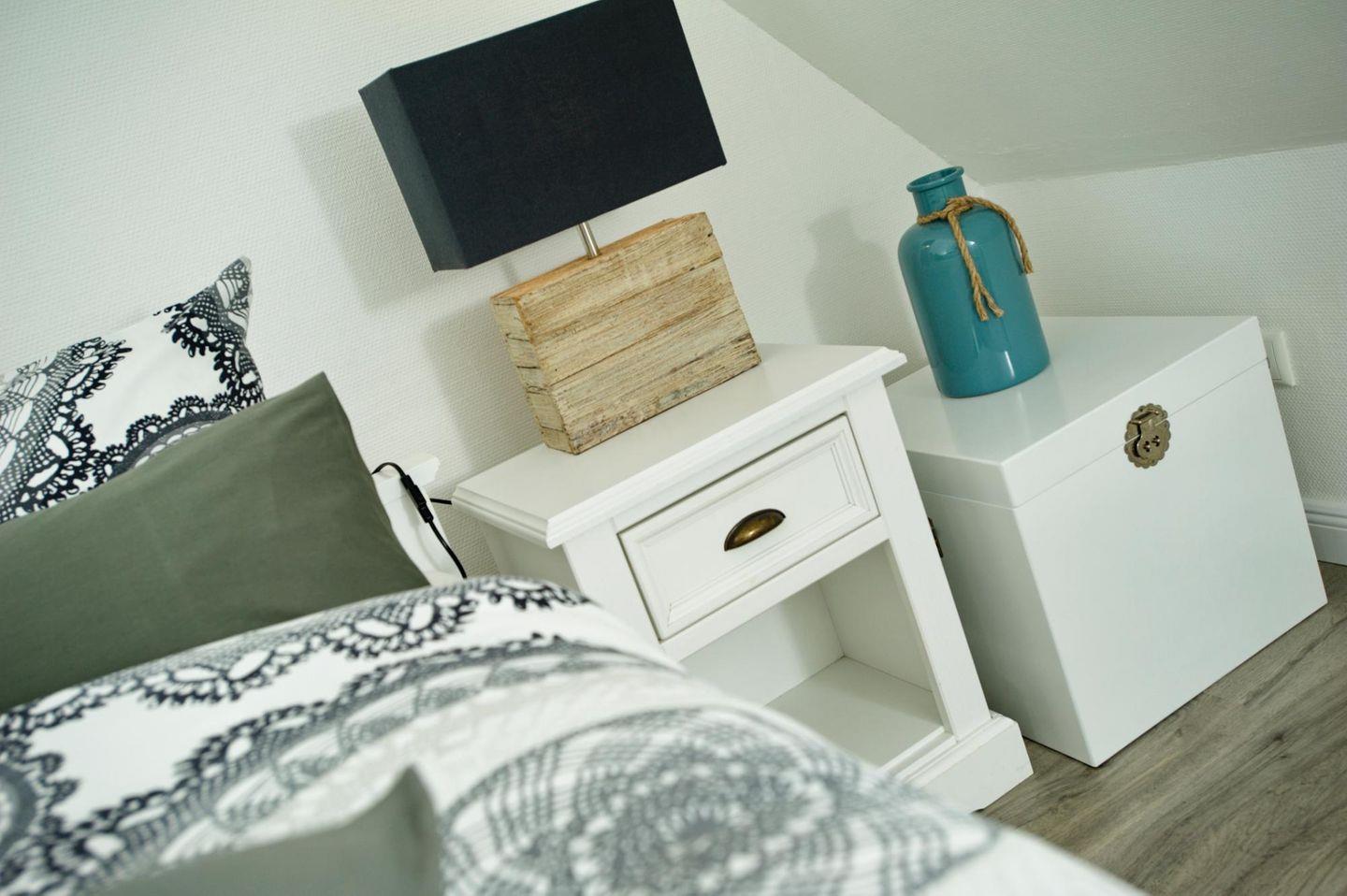 Der Schlafraum befindet sich im Dachgeschoss und lässt Sie auf Grund der wohnlichen Einrichtung in tiefe Träume verfallen. Darüber hinaus nutzen Sie die Schlafcouch im Wohnzimmer als weitere Schlafmöglichkeit.