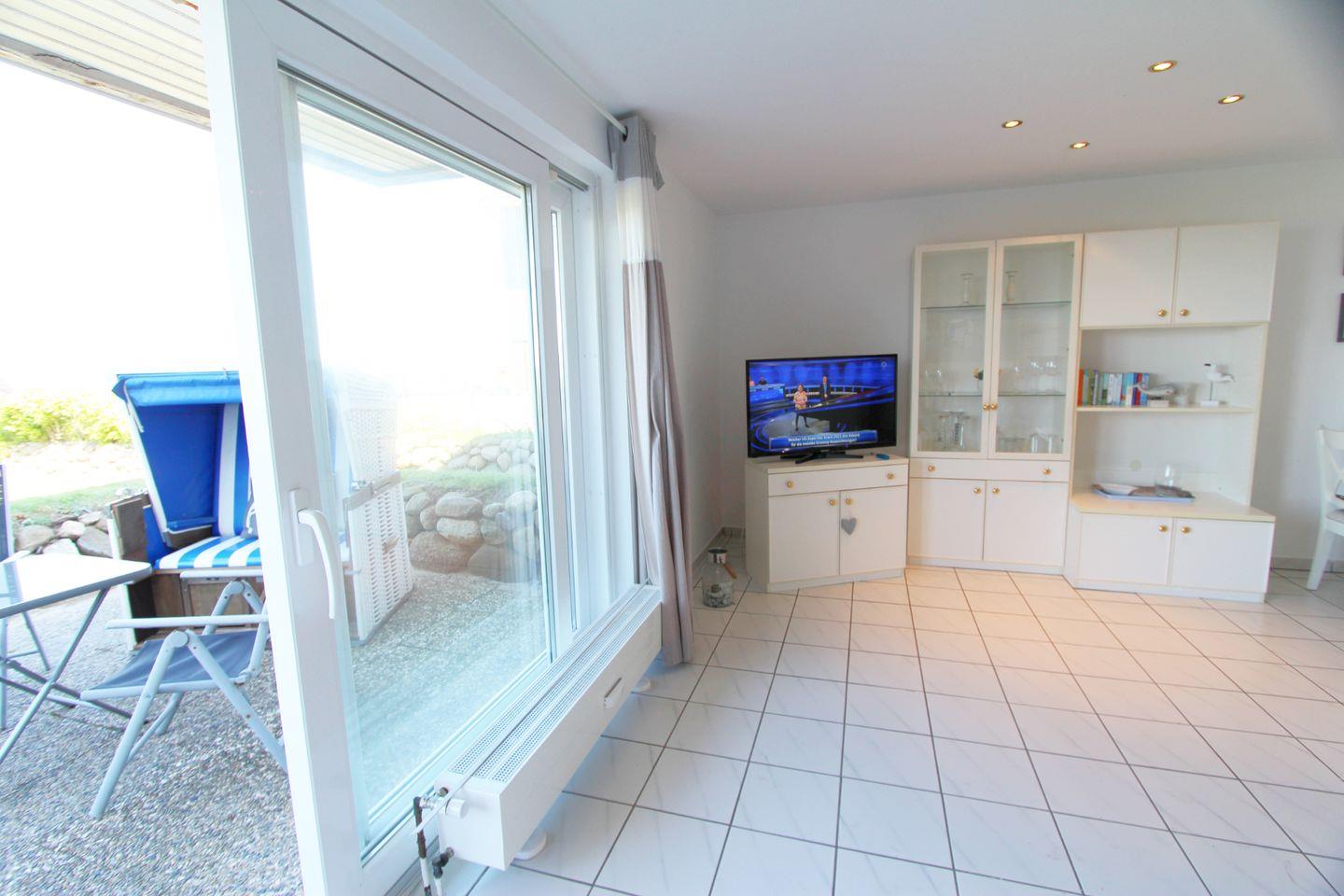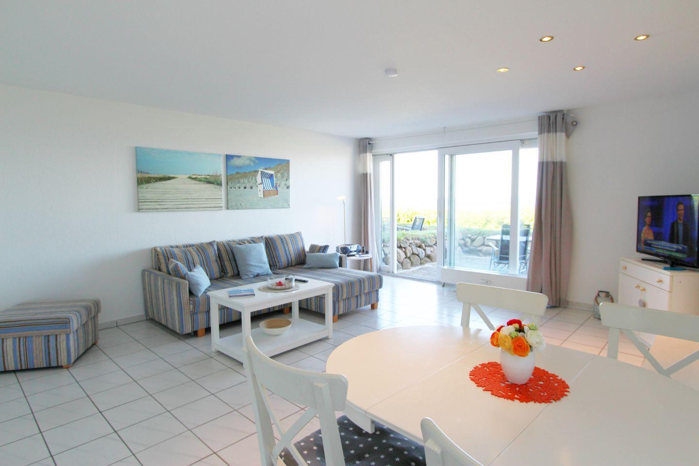 Im großzügigen Wohnbereich der Ferienwohnung im Erdgeschoss genießen Sie eine erholsame Zeit. Der einmalige Blick aufs Meer wird Sie begeistern! Die Wandbilder mit Strandmotiven lassen Sie direkt auf Sylt ankommen.