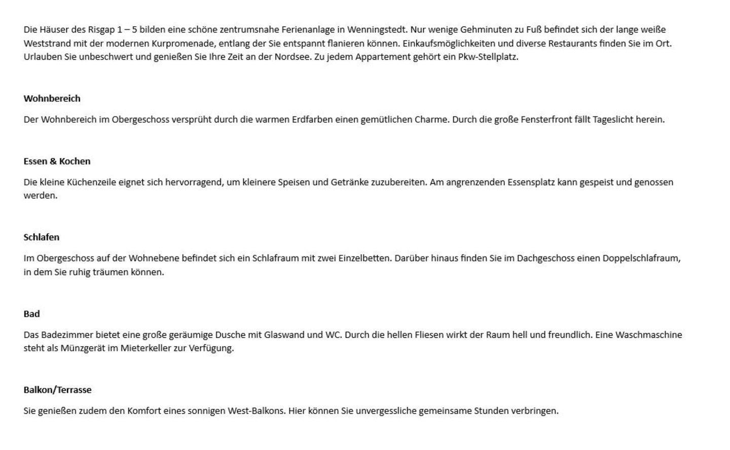 Die Häuser des Risgap 1 – 5 bilden eine schöne zentrumsnahe Ferienanlage in Wenningstedt. Nur wenige Gehminuten zu Fuß befindet sich der lange weiße Weststrand mit der modernen Kurpromenade, entlang der Sie entspannt flanieren können. Einkaufsmöglichkeiten und diverse Restaurants finden Sie im Ort. Urlauben Sie unbeschwert und genießen Sie Ihre Zeit an der Nordsee. Zu jedem Appartement gehört ein Pkw-Stellplatz.