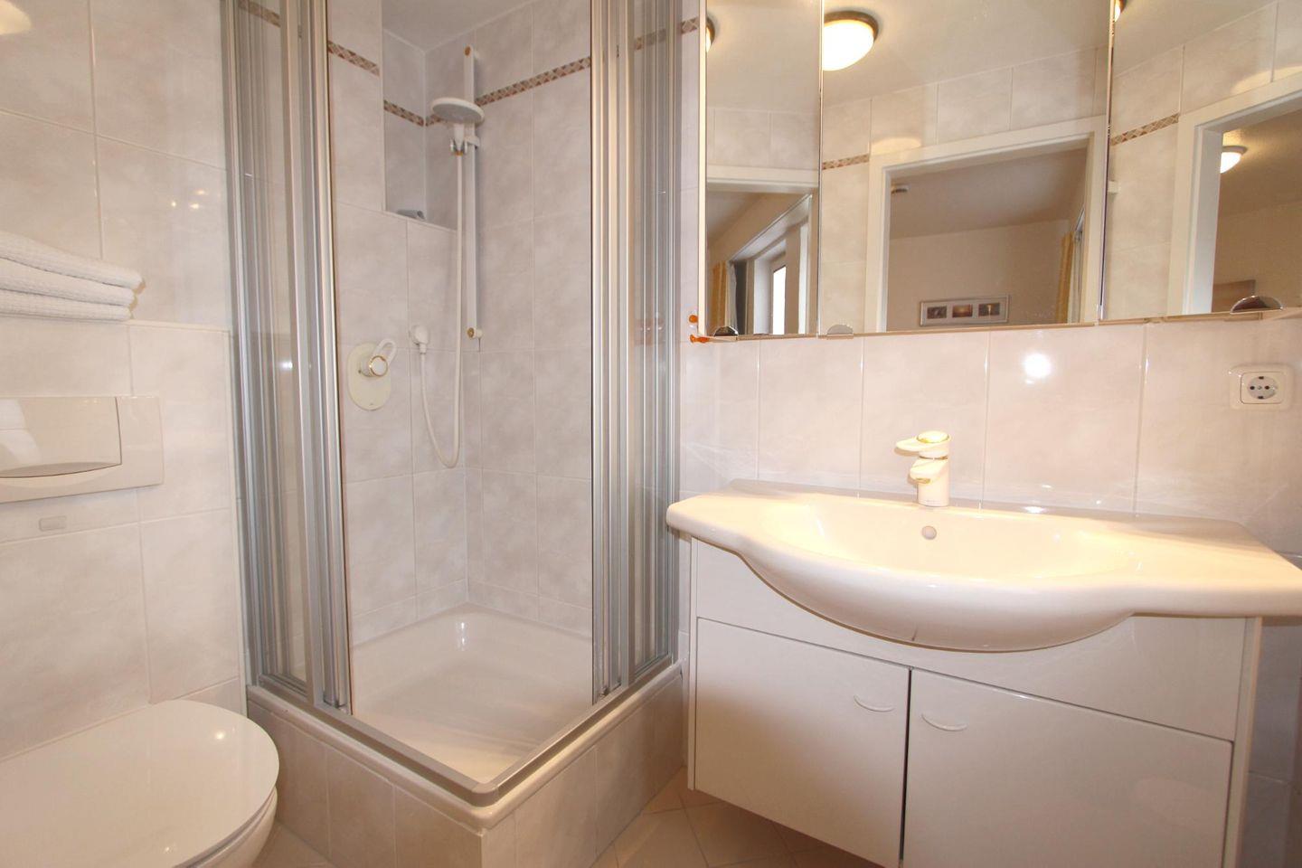 Im Untergeschoss neben dem Schlafzimmer liegt das Duschbad mit WC. Ferner verfügt die Wohnung im Erdgeschoss über ein Gäste-WC. Waschmaschine und Trockner stehen als Münzgeräte im Keller des Hauses zur Verfügung.