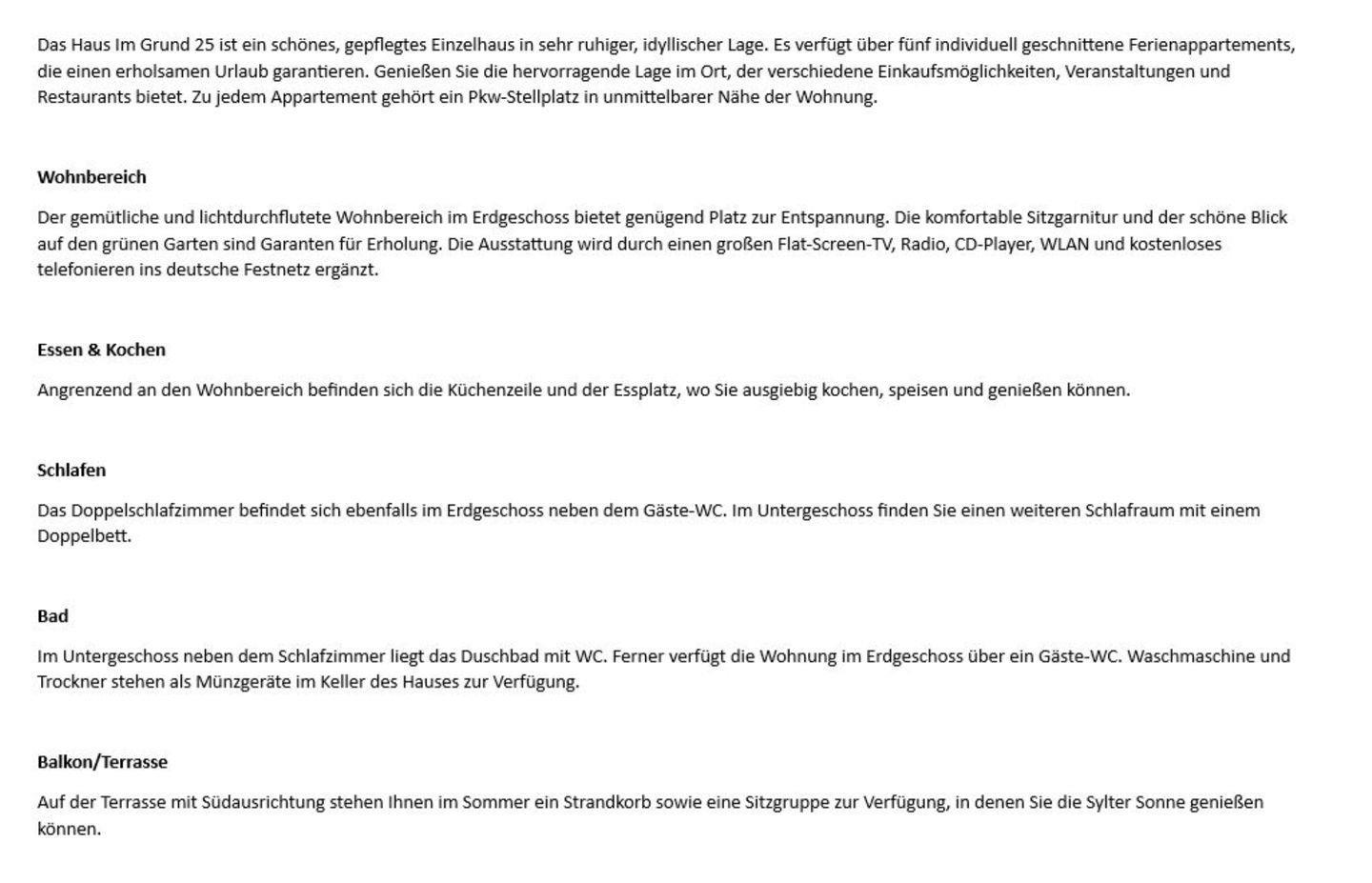 Das Haus Im Grund 25 ist ein schönes, gepflegtes Einzelhaus in sehr ruhiger, idyllischer Lage. Es verfügt über fünf individuell geschnittene Ferienappartements, die einen erholsamen Urlaub garantieren. Genießen Sie die hervorragende Lage im Ort, der verschiedene Einkaufsmöglichkeiten, Veranstaltungen und Restaurants bietet. Zu jedem Appartement gehört ein Pkw-Stellplatz in unmittelbarer Nähe der Wohnung.