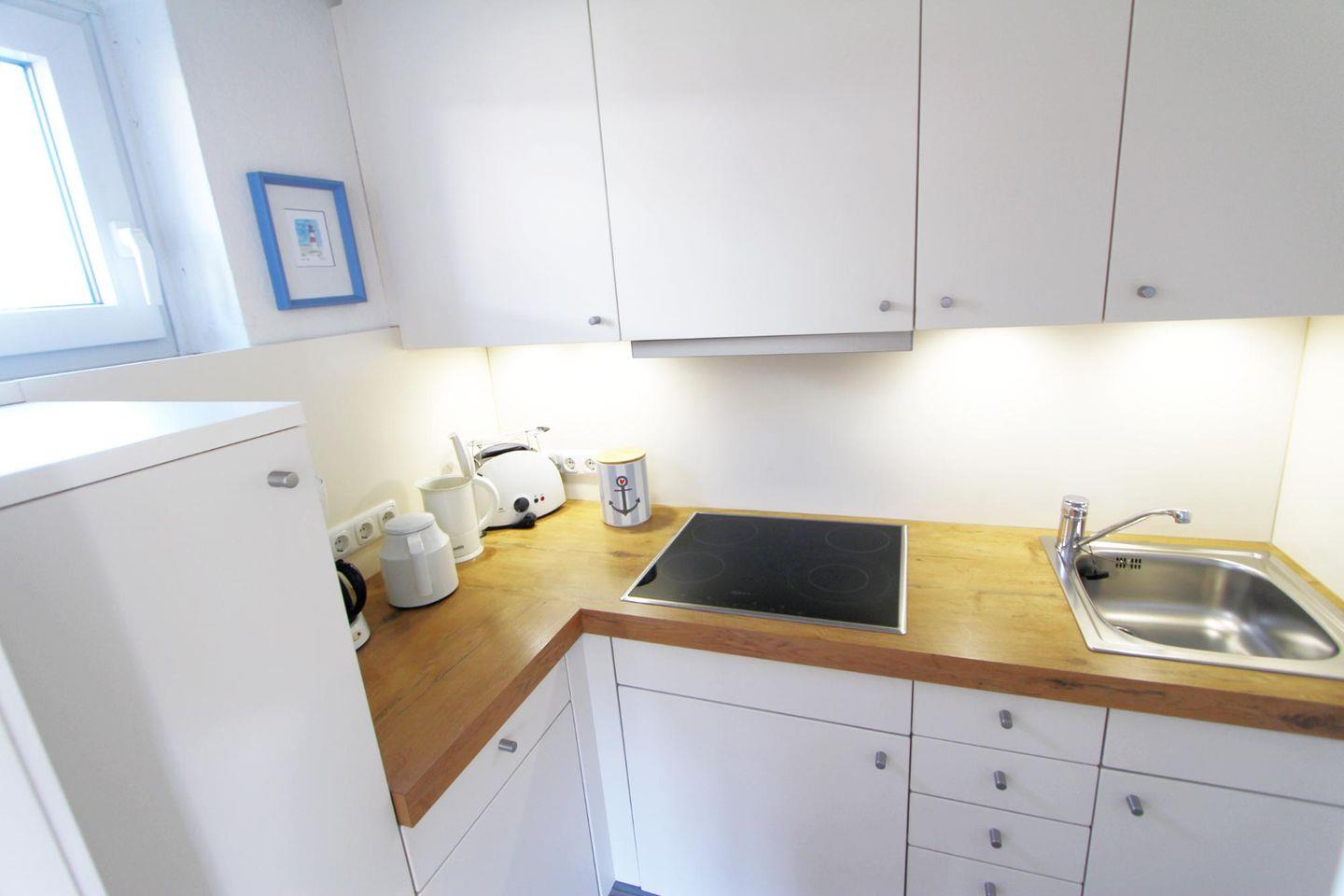 In der modern gestalteten, offenen Küche haben Sie die Möglichkeit, sich Speisen und Getränke Ihrer Wahl zuzubereiten. So ist neben dem seelischen auch für das leibliche Wohl gesorgt. Achtung, kein Backofen.