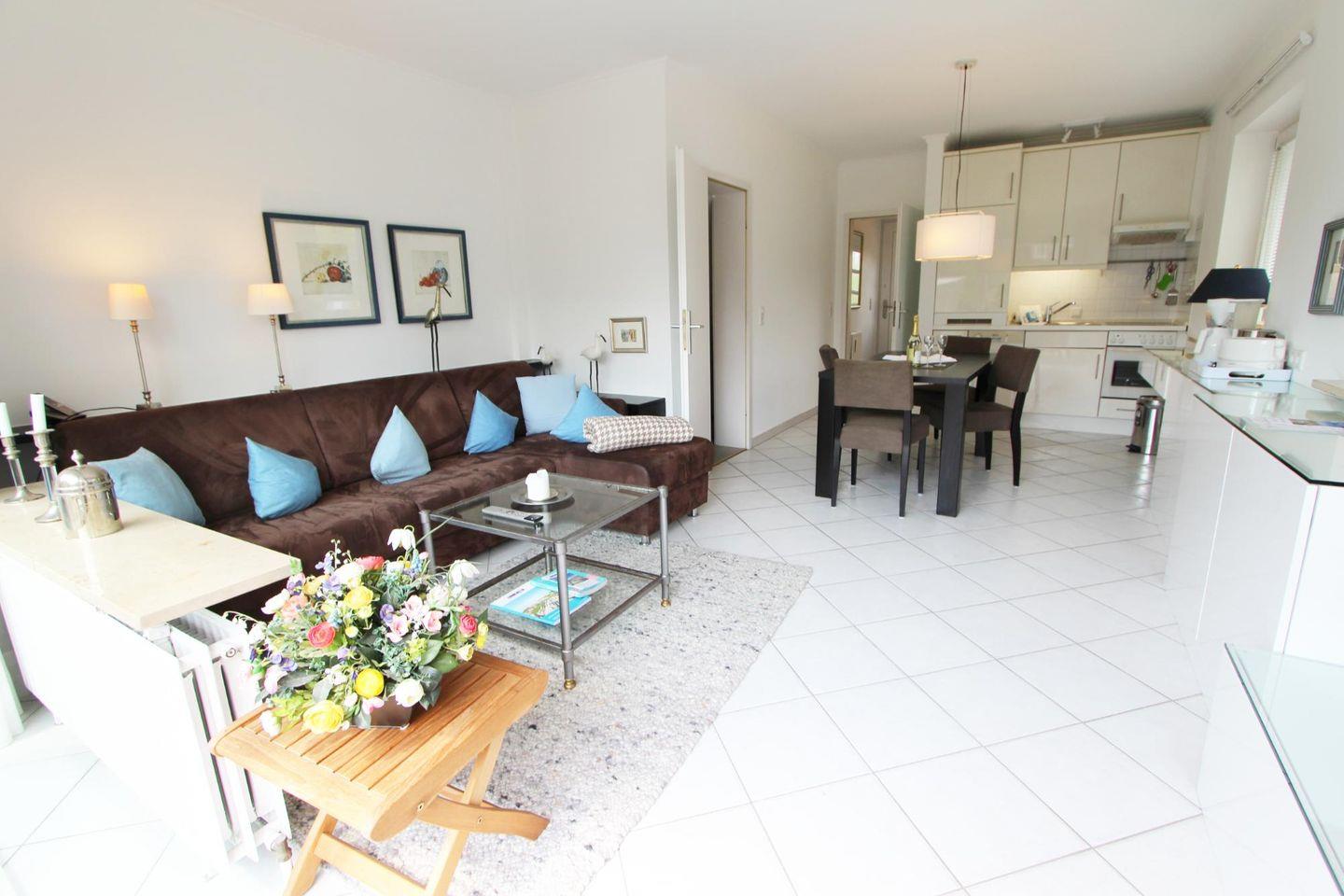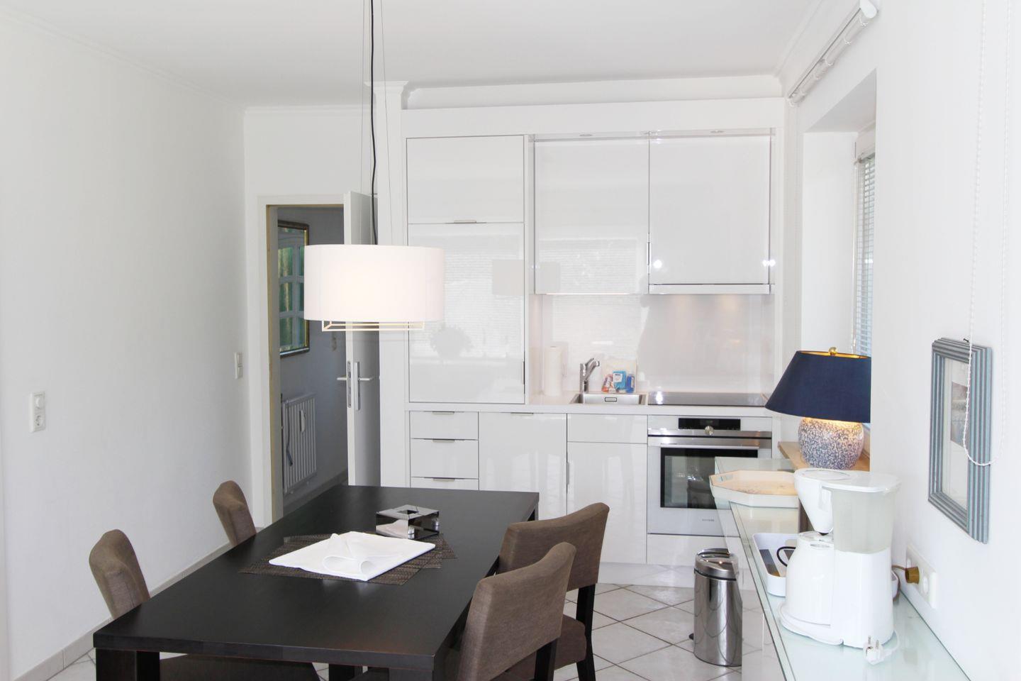 In der offen geschnittenen Küche können Sie bequem kleinere Speisen und Getränke zubereiten. Der angrenzende Essbereich bietet Platz für vier Personen.