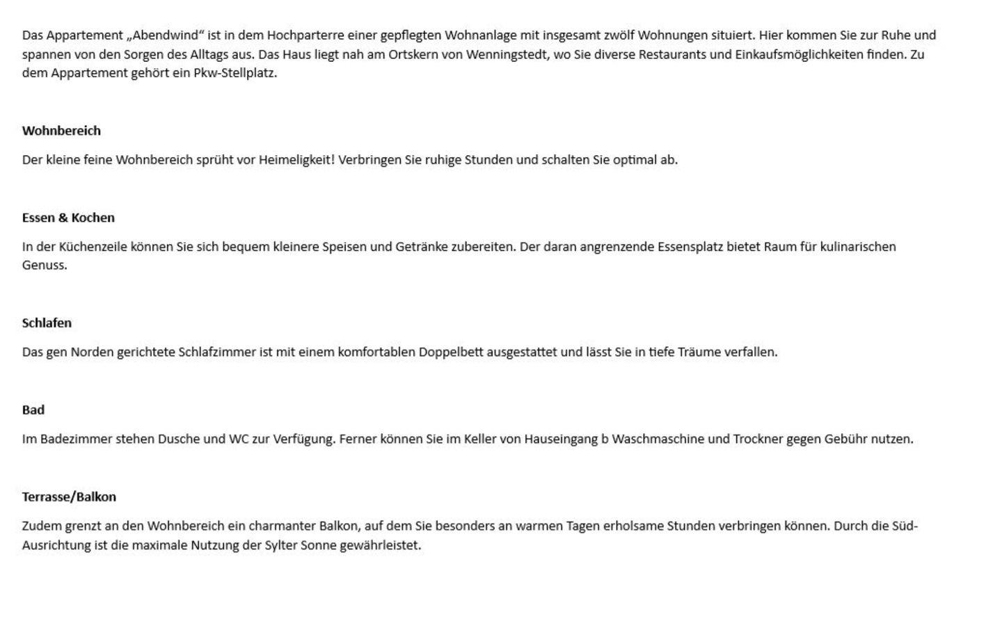 Das Appartement „Abendwind“ ist in dem Hochparterre einer gepflegten Wohnanlage mit insgesamt zwölf Wohnungen situiert. Hier kommen Sie zur Ruhe und spannen von den Sorgen des Alltags aus. Das Haus liegt nah am Ortskern von Wenningstedt, wo Sie diverse Restaurants und Einkaufsmöglichkeiten finden. Zu dem Appartement gehört ein Pkw-Stellplatz.