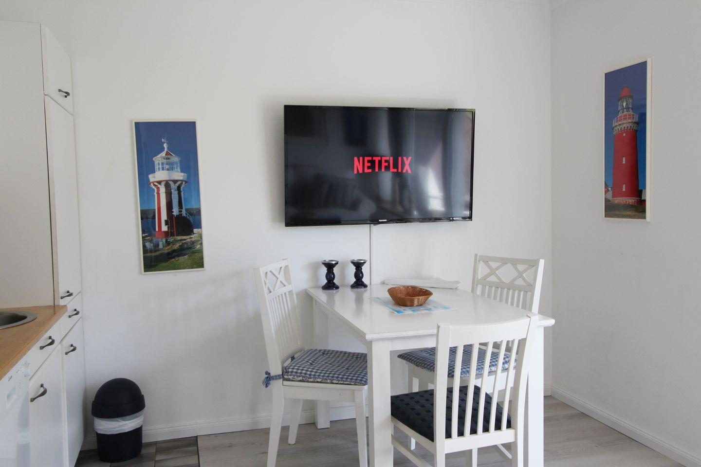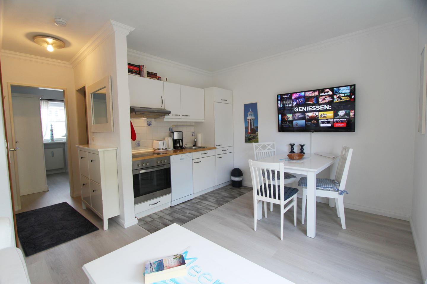 In der Küchenzeile können Sie sich bequem kleinere Speisen und Getränke zubereiten. Der daran angrenzende Essensplatz bietet Raum für kulinarischen Genuss.