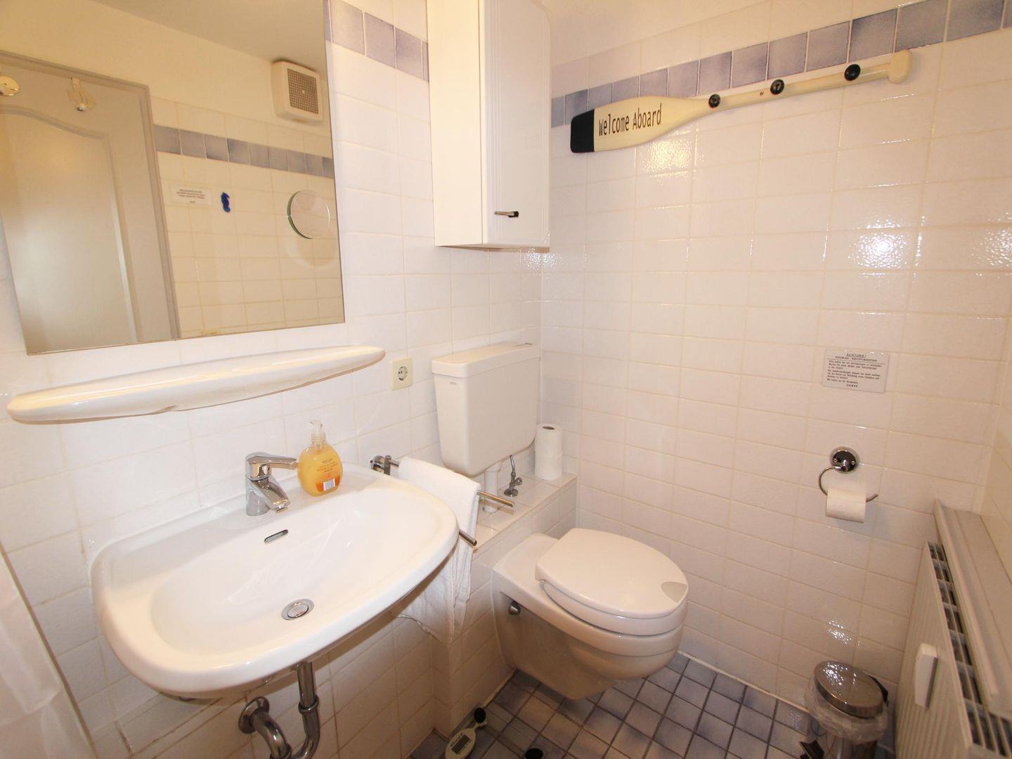 Im hell gefliesten Duschbad mit WC können Sie sich für den anstehenden Urlaubstag erfrischen. Zudem steht eine Waschmaschine zur Nutzung bereit.