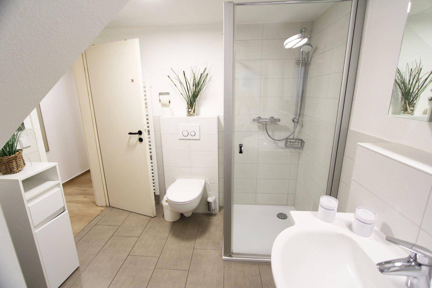 Ebenfalls sehr hell und freundlich ist das schöne Duschbad mit WC im Untergeschoss gestaltet. Hier können Sie sich für den Urlaubstag frisch machen und optimal in den Tag starten.