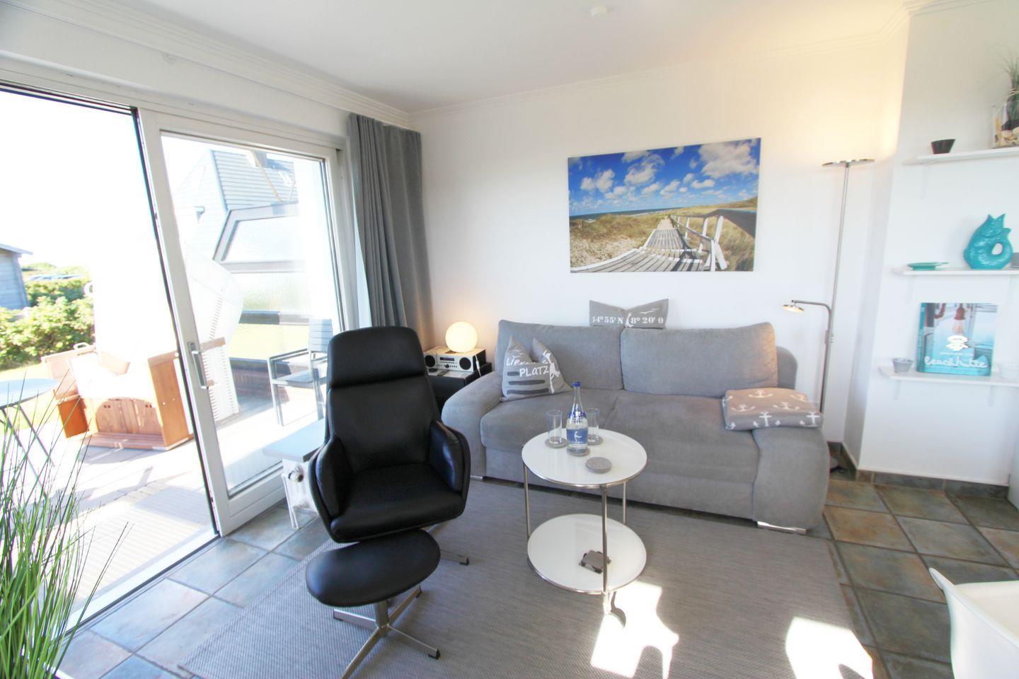 Die West-Terrasse begeistert durch den salzigen Geruch des Meeres, auf welches Sie teilweise Blick haben. Beobachten Sie von hier aus das Lichtspiel der Sylter Sonnenuntergänge. Ihnen steht ein Strandkorb zur Verfügung (April bis Oktober).