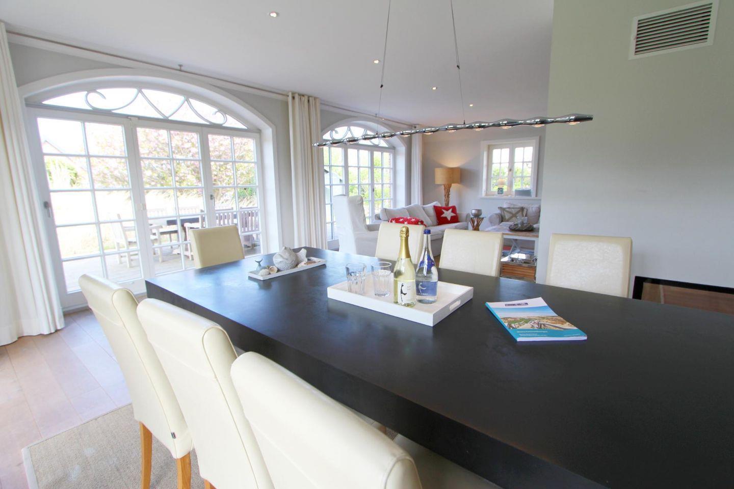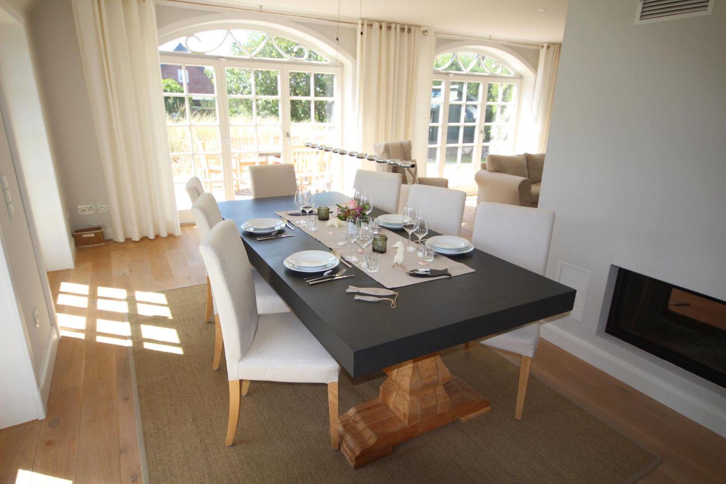 Die moderne Küche ist umfassend ausgestattet, sodass man entspannt gemeinsam kochen kann. Bereiten Sie hier mit viel Liebe zusammen Ihre Leibspeise zu. Am angrenzenden großen Essplatz finden bequem bis zu acht Personen Platz.