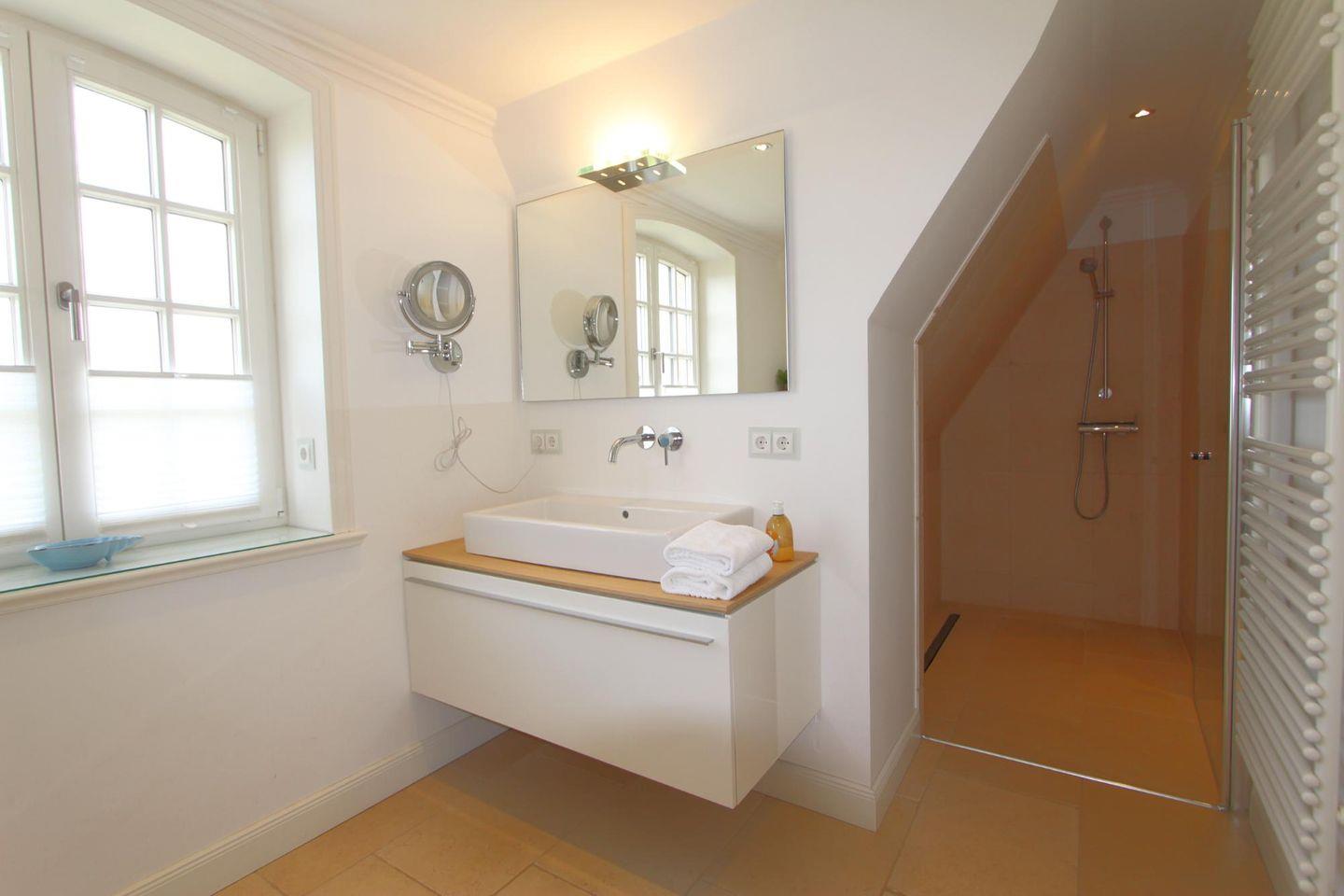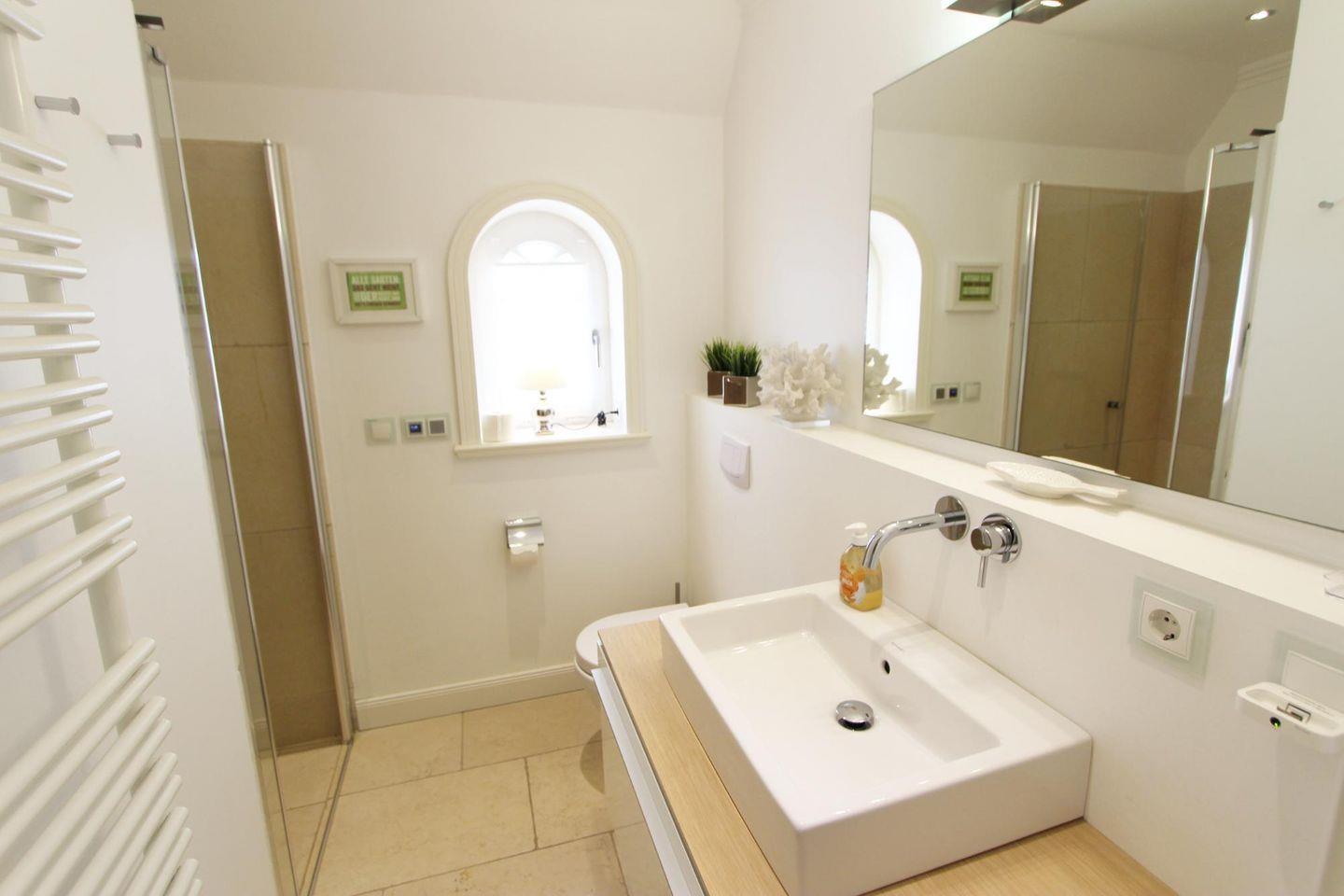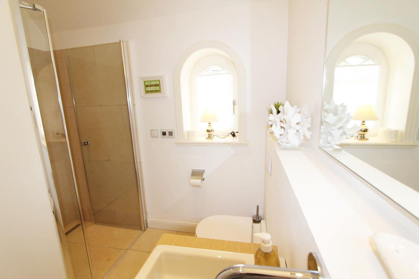 Das Haus verfügt über ein Duschbad mit WC im Erdgeschoss und ein Badzimmer mit WC, Dusche und Wanne im Obergeschoss. Ferner nutzen Sie auf der Schlafebene noch ein Gäste-WC. Alle Bäder sind mit hochwertigem Limestone-Naturstein gefliest.