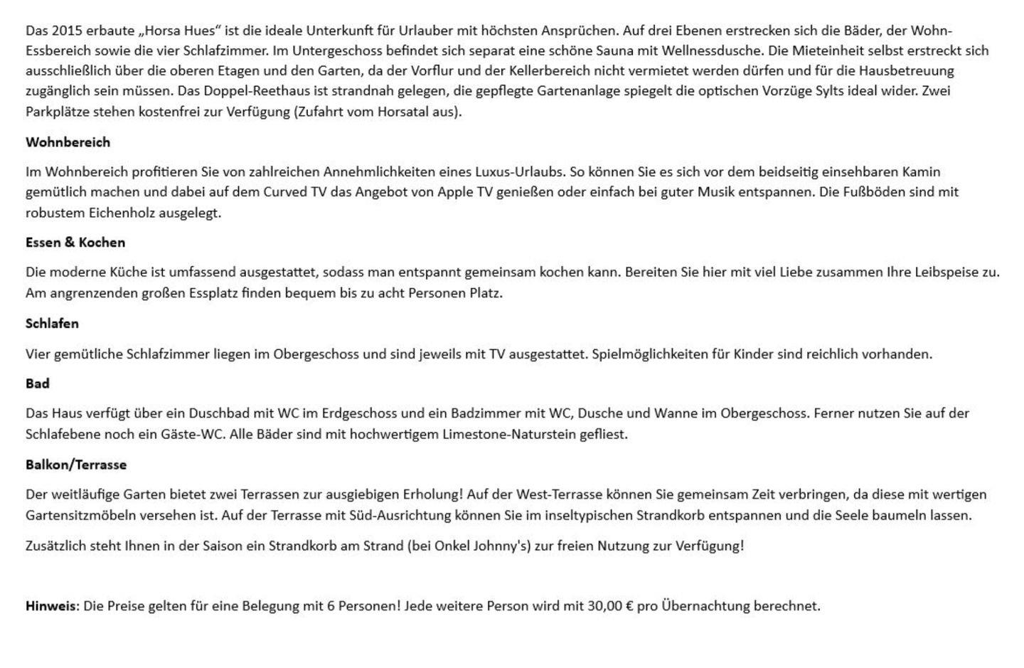 Das 2015 erbaute „Horsa Hues“ ist die ideale Unterkunft für Urlauber mit höchsten Ansprüchen. Auf drei Ebenen erstrecken sich die Bäder, der Wohn-Essbereich sowie die vier Schlafzimmer. Im Untergeschoss befindet sich separat eine schöne Sauna mit Wellnessdusche. Die Mieteinheit selbst erstreckt sich ausschließlich über die oberen Etagen und den Garten, da der Vorflur und der Kellerbereich nicht vermietet werden dürfen und für die Hausbetreuung zugänglich sein müssen. Das Doppel-Reethaus ist strandnah gelegen, die gepflegte Gartenanlage spiegelt die optischen Vorzüge Sylts ideal wider. Zwei Parkplätze stehen kostenfrei zur Verfügung (Zufahrt vom Horsatal aus).