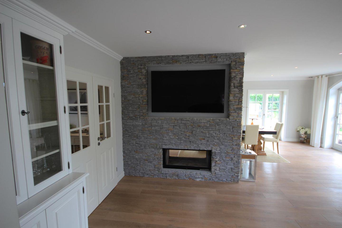 Im Wohnbereich profitieren Sie von zahlreichen Annehmlichkeiten eines Luxus-Urlaubs. So können Sie es sich vor dem beidseitig einsehbaren Kamin gemütlich machen und dabei auf dem Curved TV das Angebot von Apple TV genießen oder einfach bei guter Musik entspannen. Die Fußböden sind mit robustem Eichenholz ausgelegt.