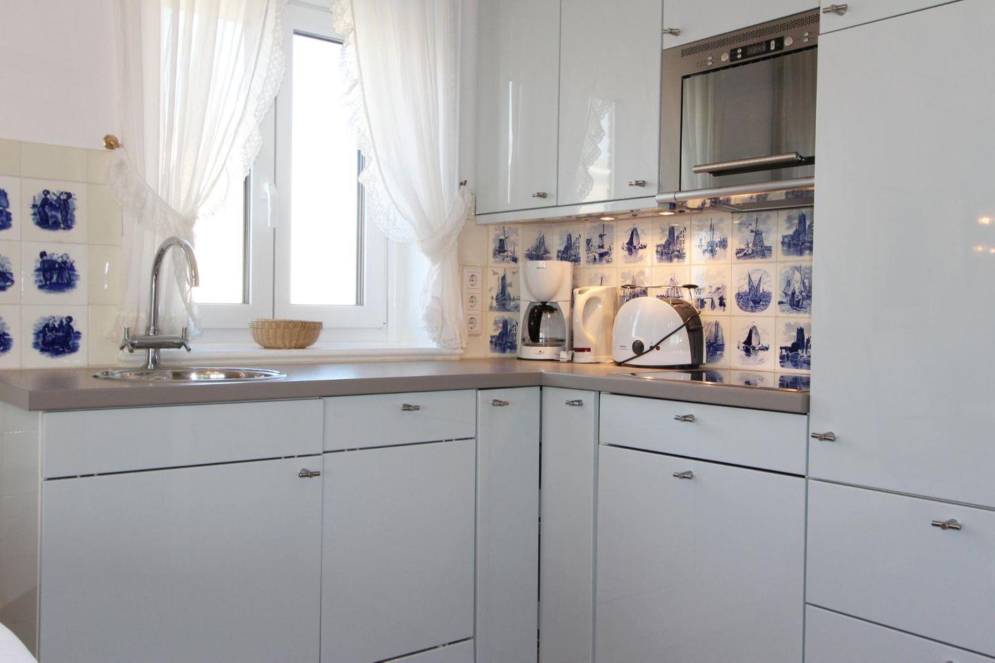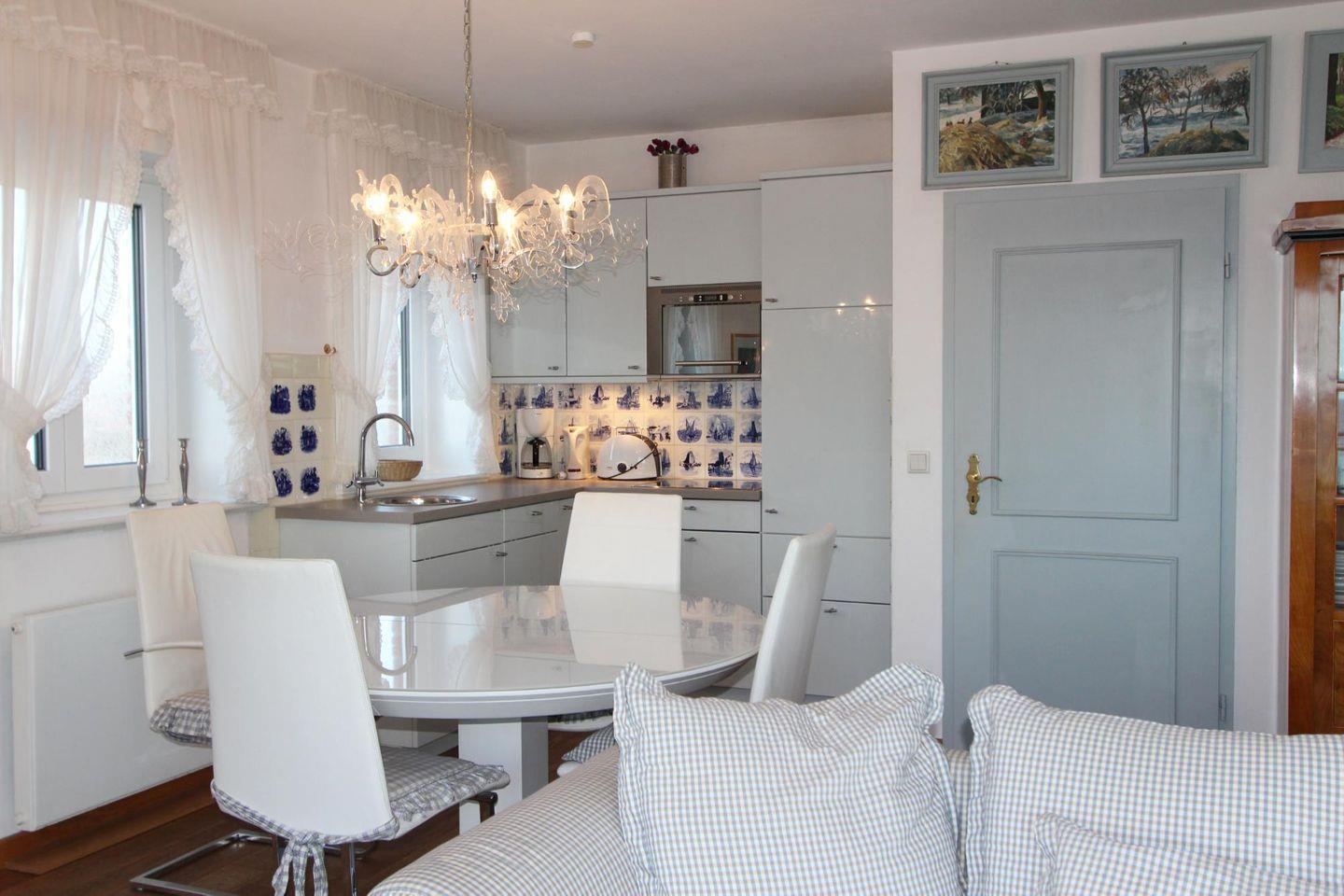 Die Küche mit charmantem friesischem Fliesenspiegel und hochwertiger Ausstattung bietet ausreichend Platz, Speisen und Getränke zuzubereiten. Am runden Esstisch, welcher von einem edlen Leuchter überthront wird, kann nach Herzenslust gespeist werden.