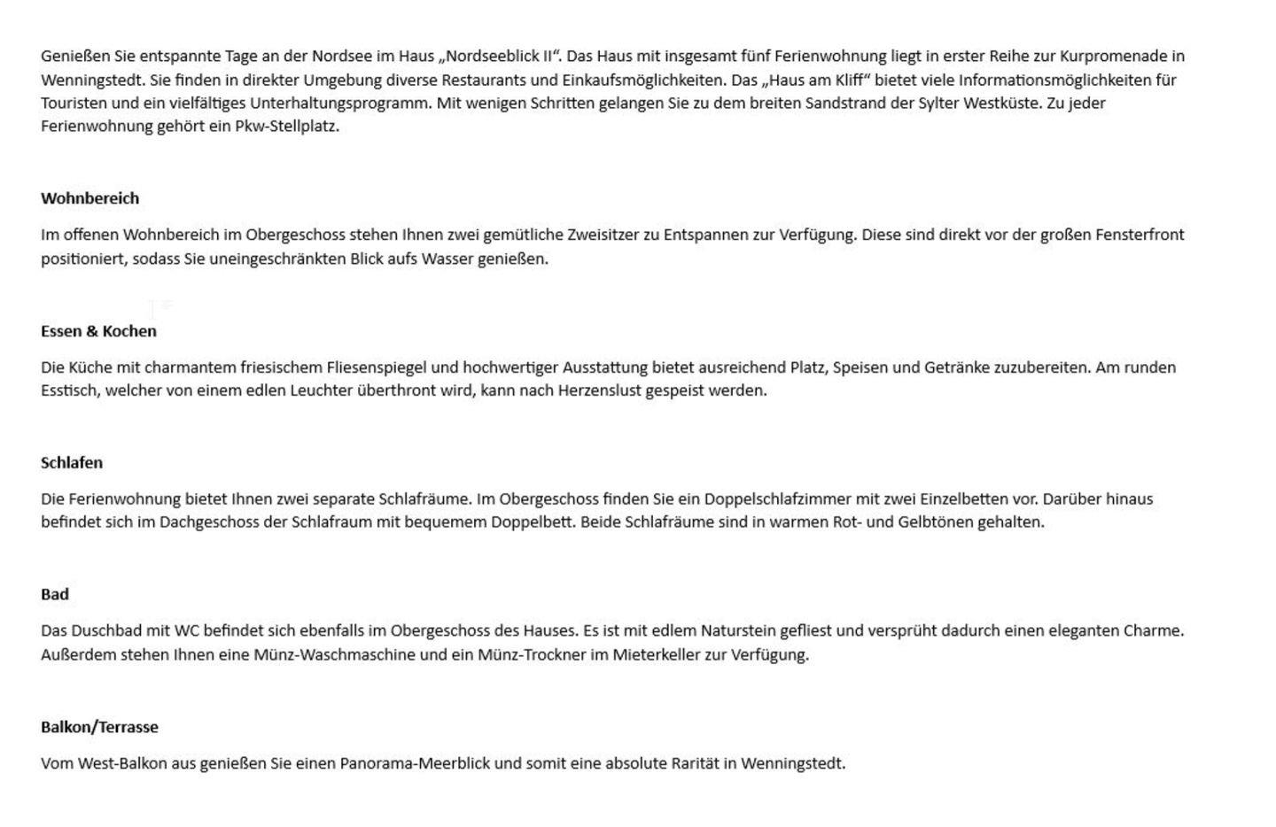 Genießen Sie entspannte Tage an der Nordsee im Haus „Nordseeblick II“. Das Haus mit insgesamt fünf Ferienwohnung liegt in erster Reihe zur Kurpromenade in Wenningstedt. Sie finden in direkter Umgebung diverse Restaurants und Einkaufsmöglichkeiten. Das „Haus am Kliff“ bietet viele Informationsmöglichkeiten für Touristen und ein vielfältiges Unterhaltungsprogramm. Mit wenigen Schritten gelangen Sie zu dem breiten Sandstrand der Sylter Westküste. Zu jeder Ferienwohnung gehört ein Pkw-Stellplatz.