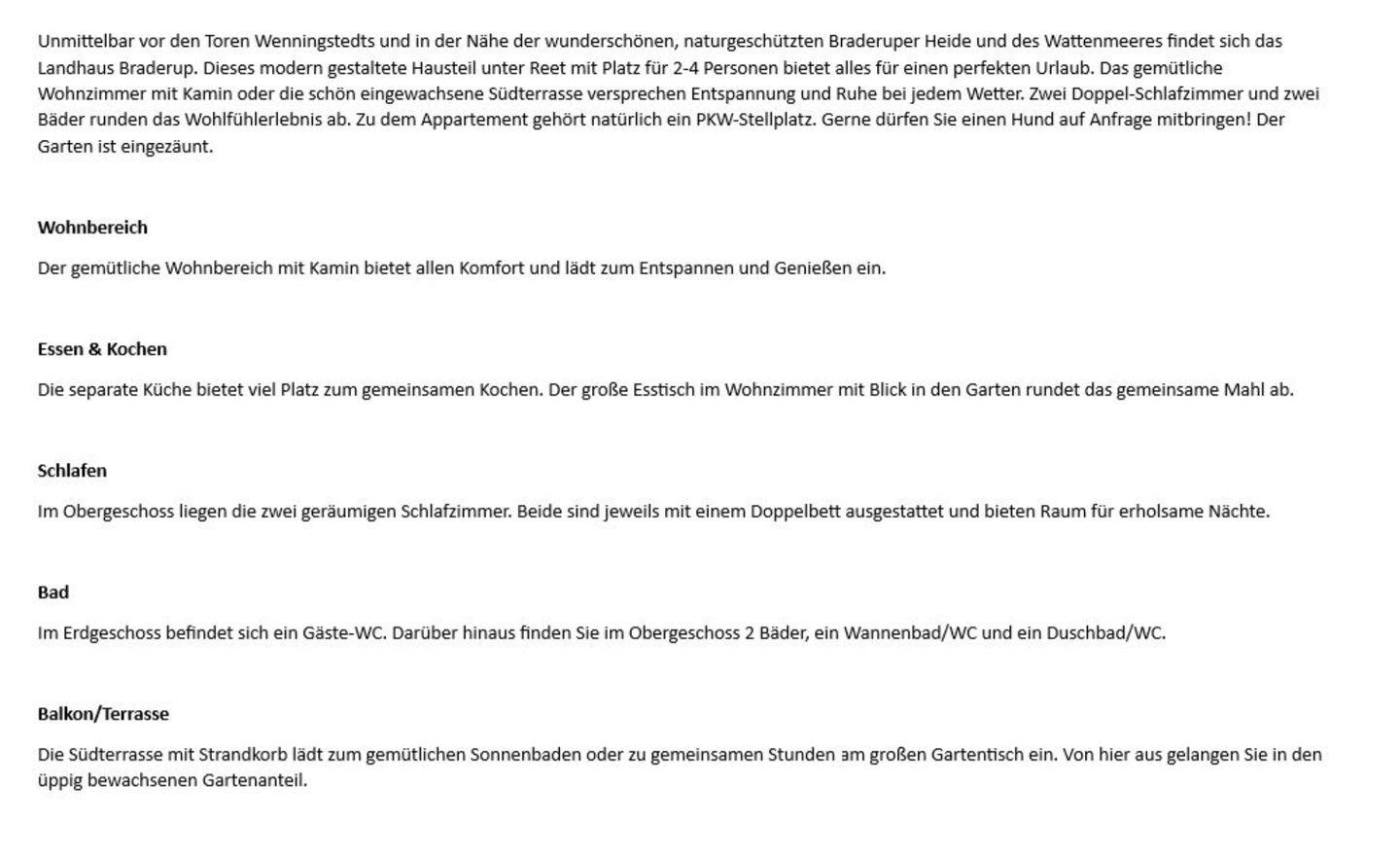 Unmittelbar vor den Toren Wenningstedts und in der Nähe der wunderschönen, naturgeschützten Braderuper Heide und des Wattenmeeres findet sich das Landhaus Braderup. Dieses modern gestaltete Hausteil unter Reet mit Platz für 2-4 Personen bietet alles für einen perfekten Urlaub. Das gemütliche Wohnzimmer mit Kamin oder die schön eingewachsene Südterrasse versprechen Entspannung und Ruhe bei jedem Wetter. Zwei Doppel-Schlafzimmer und zwei Bäder runden das Wohlfühlerlebnis ab. Zu dem Appartement gehört natürlich ein PKW-Stellplatz. Gerne dürfen Sie einen Hund auf Anfrage mitbringen! Der Garten ist eingezäunt.