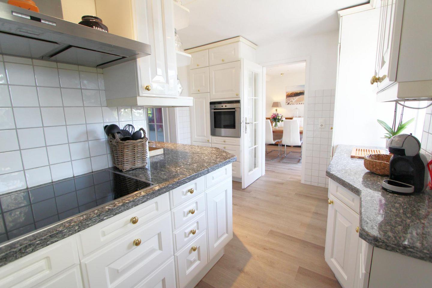 Die separate Küche bietet viel Platz zum gemeinsamen Kochen. Der große Esstisch im Wohnzimmer mit Blick in den Garten rundet das gemeinsame Mahl ab.