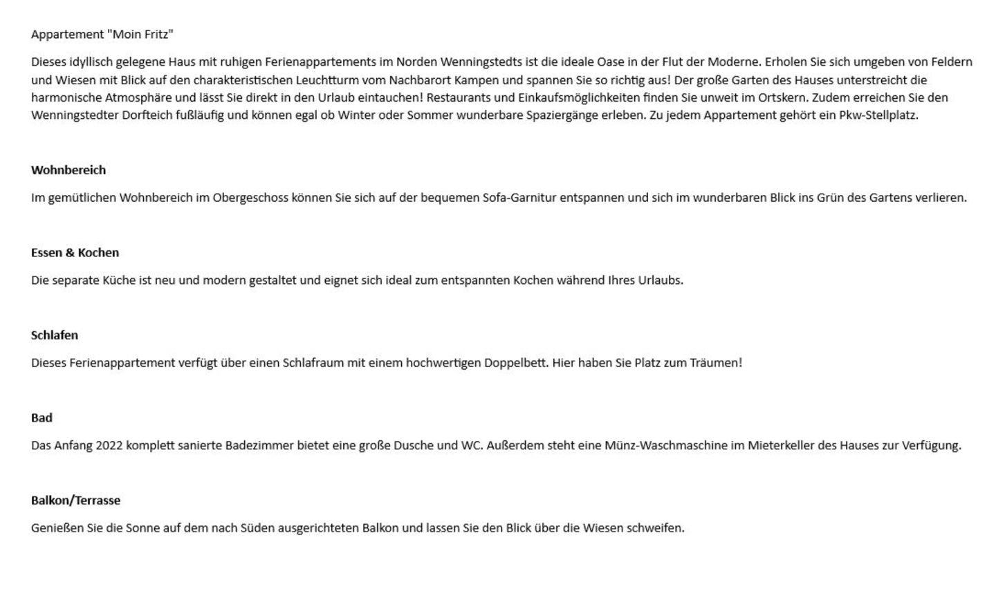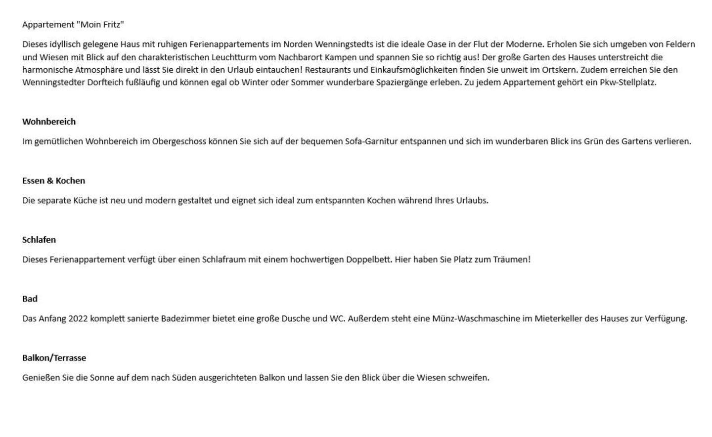 Dieses idyllisch gelegene Haus mit ruhigen Ferienappartements im Norden Wenningstedts ist die ideale Oase in der Flut der Moderne. Erholen Sie sich umgeben von Feldern und Wiesen mit Blick auf den charakteristischen Leuchtturm vom Nachbarort Kampen und spannen Sie so richtig aus! Der große Garten des Hauses unterstreicht die harmonische Atmosphäre und lässt Sie direkt in den Urlaub eintauchen! Restaurants und Einkaufsmöglichkeiten finden Sie unweit im Ortskern. Zudem erreichen Sie den Wenningstedter Dorfteich fußläufig und können egal ob Winter oder Sommer wunderbare Spaziergänge erleben. Zu jedem Appartement gehört ein Pkw-Stellplatz.