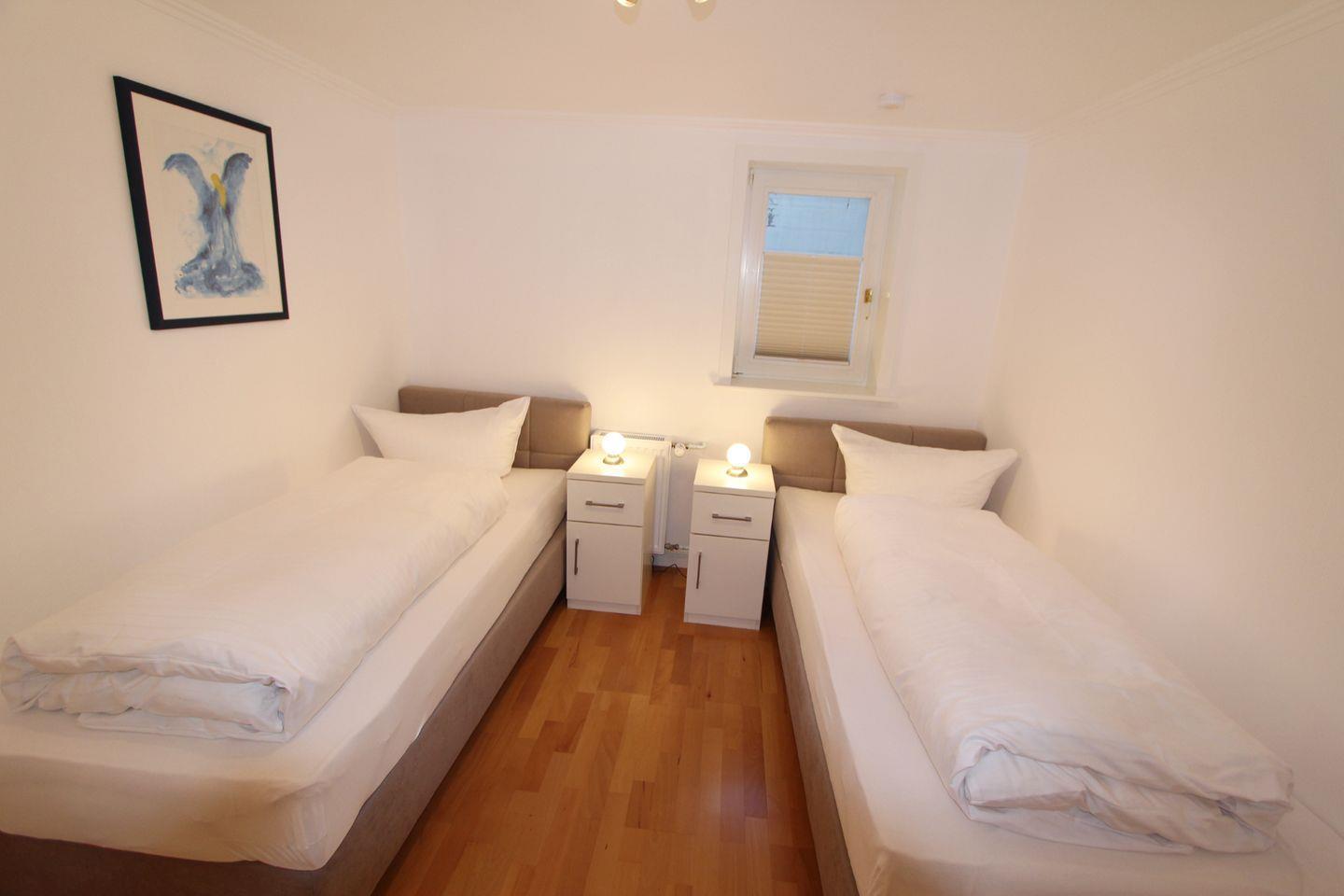 Im Untergeschoss der Ferienwohnung finden Sie zwei Schlafzimmer. Das größere Doppelschlafzimmer bietet Ihnen ein komfortables Boxspringbett. Im kleineren Schlafzimmer stehen Ihnen zwei einzelne Boxspringbetten.