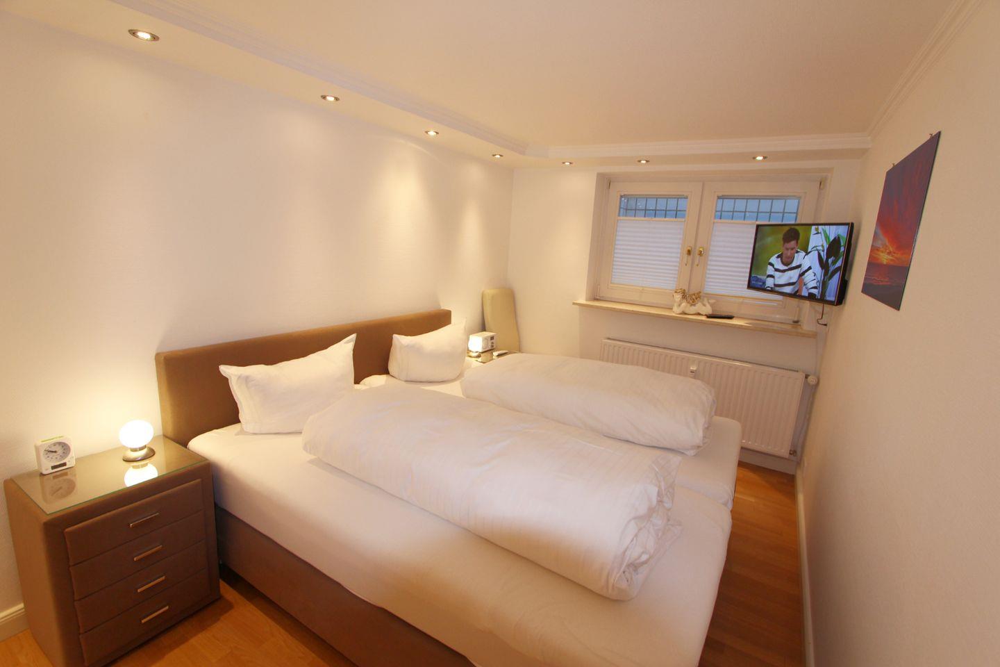 Im Untergeschoss der Ferienwohnung finden Sie zwei Schlafzimmer. Das größere Doppelschlafzimmer bietet Ihnen ein komfortables Boxspringbett (durchgehender Topper). Im kleineren Schlafzimmer stehen Ihnen zwei einzelne Boxspringbetten.