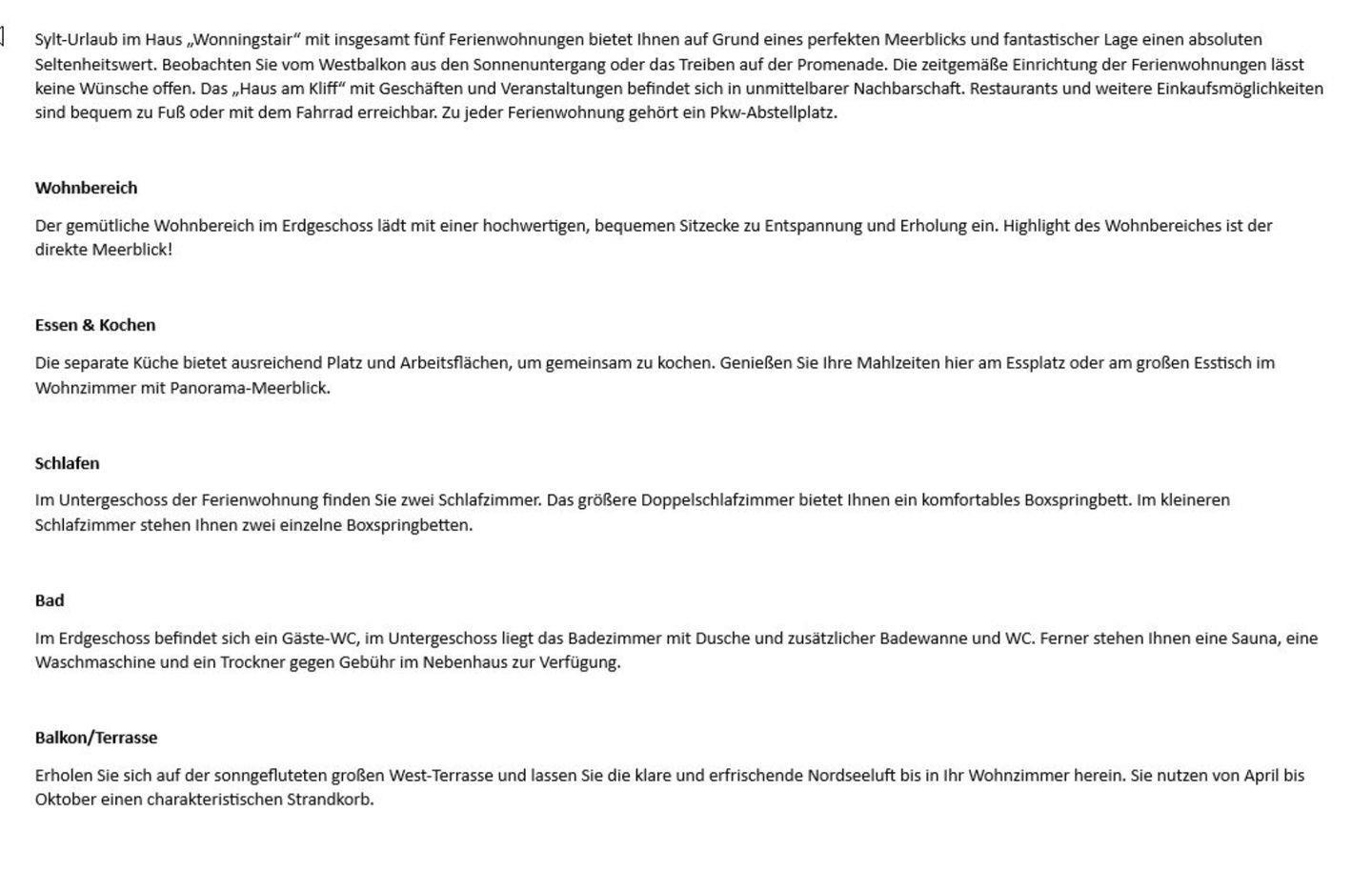 Sylt-Urlaub im Haus „Wonningstair“ mit insgesamt fünf Ferienwohnungen bietet Ihnen auf Grund eines perfekten Meerblicks und fantastischer Lage einen absoluten Seltenheitswert. Beobachten Sie vom Westbalkon aus den Sonnenuntergang oder das Treiben auf der Promenade. Die zeitgemäße Einrichtung der Ferienwohnungen lässt keine Wünsche offen. Das „Haus am Kliff“ mit Geschäften und Veranstaltungen befindet sich in unmittelbarer Nachbarschaft. Restaurants und weitere Einkaufsmöglichkeiten sind bequem zu Fuß oder mit dem Fahrrad erreichbar. Zu jeder Ferienwohnung gehört ein Pkw-Abstellplatz.