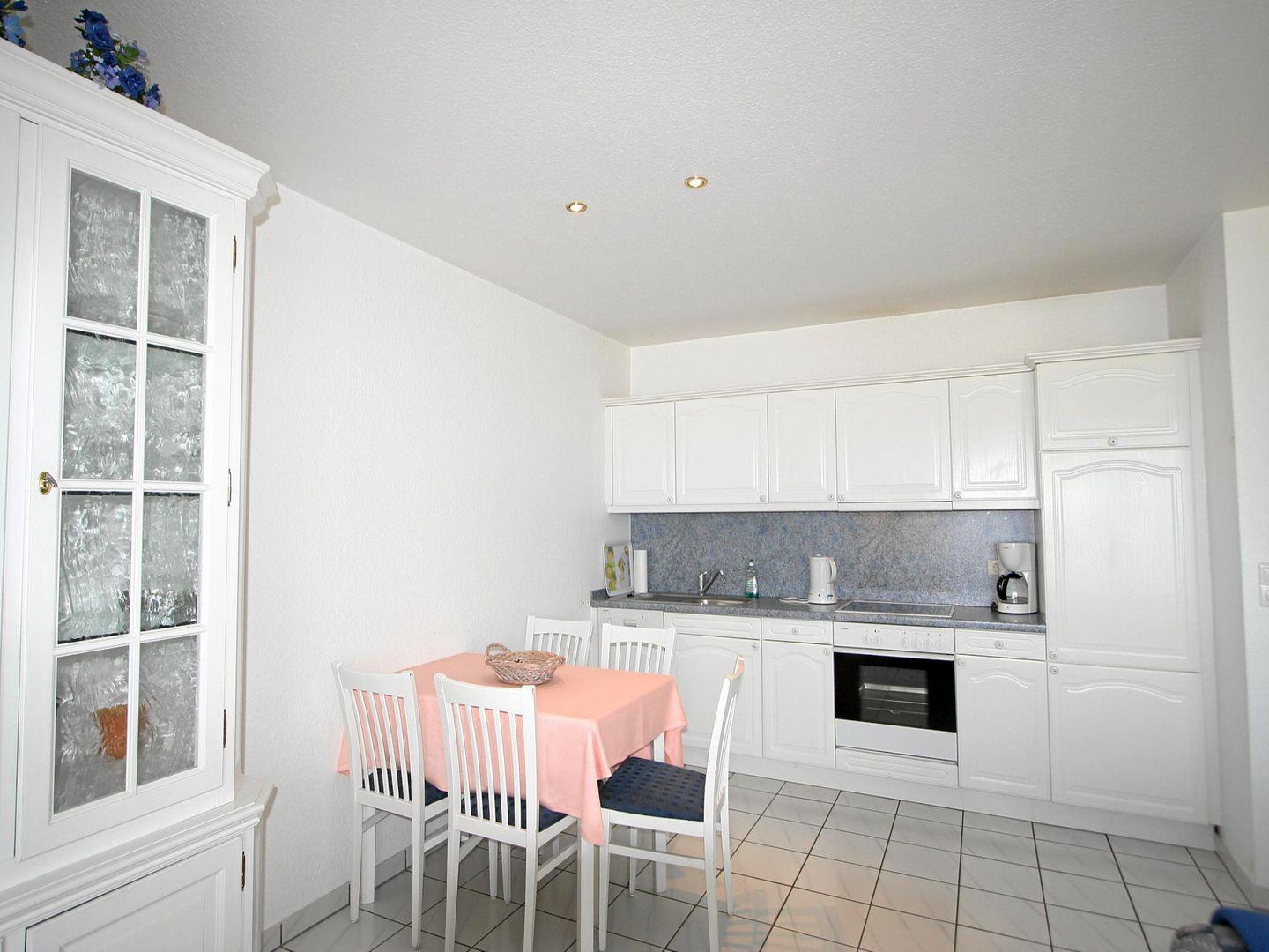 Die offene Küche bietet ausreichend Platz und Arbeitsflächen, um gemeinsam zu kochen. In dem hellen Essensbereich kann gegessen werden.