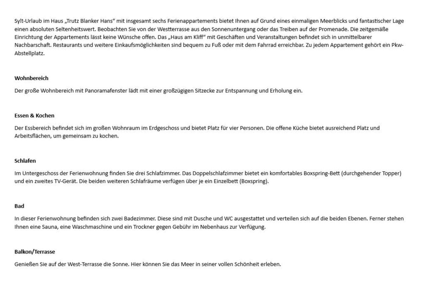 Sylt-Urlaub im Haus „Trutz Blanker Hans“ mit insgesamt sechs Ferienappartements bietet Ihnen auf Grund eines einmaligen Meerblicks und fantastischer Lage einen absoluten Seltenheitswert. Beobachten Sie von der Westterrasse aus den Sonnenuntergang oder das Treiben auf der Promenade. Die zeitgemäße Einrichtung der Appartements lässt keine Wünsche offen. Das „Haus am Kliff“ mit Geschäften und Veranstaltungen befindet sich in unmittelbarer Nachbarschaft. Restaurants und weitere Einkaufsmöglichkeiten sind bequem zu Fuß oder mit dem Fahrrad erreichbar. Zu jedem Appartement gehört ein Pkw-Abstellplatz.