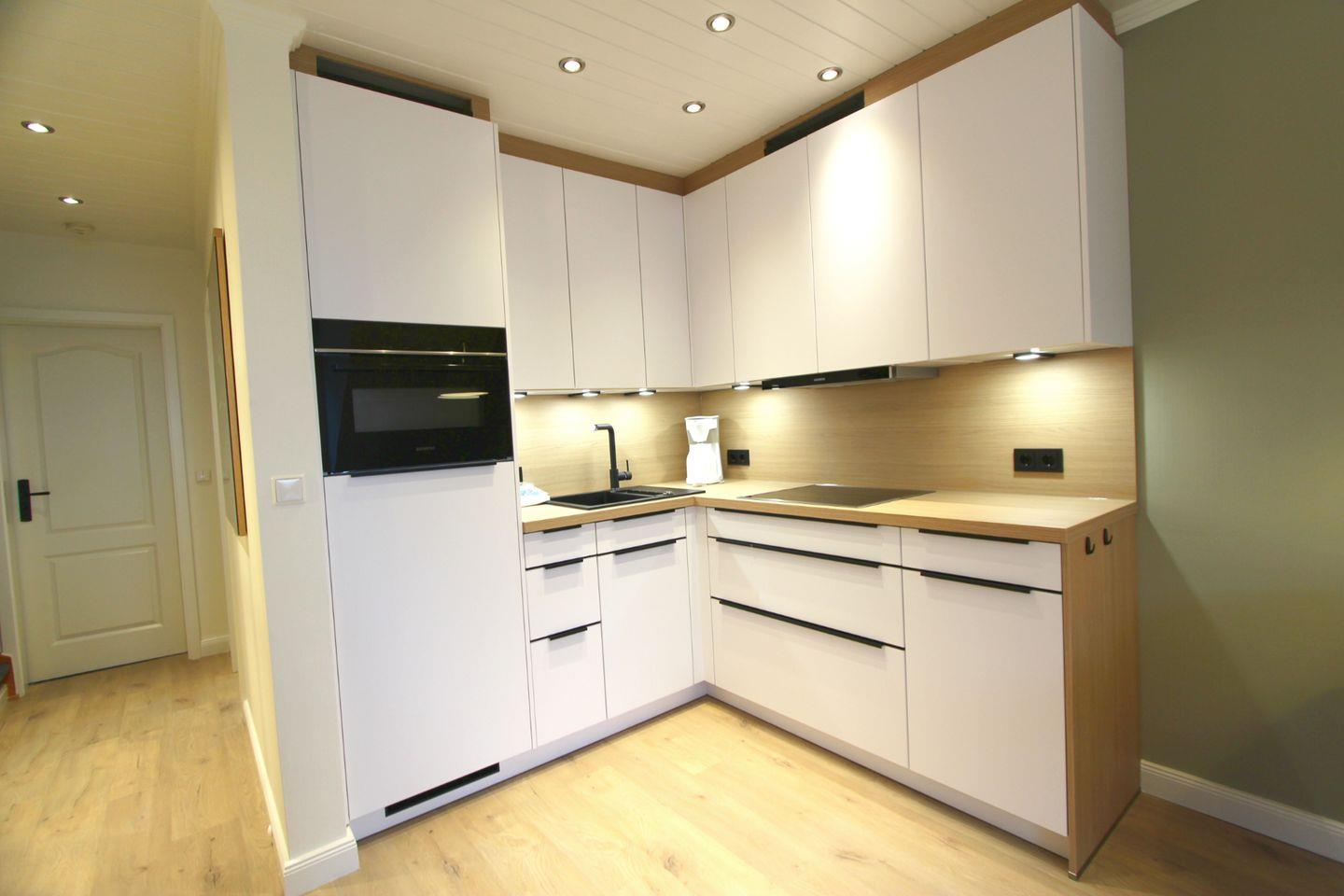 Die offene Küchenzeile lädt zum Kochen ein. Der Esstisch im Wohnbereich bietet Platz für die gemeinsamen Mahlzeiten.