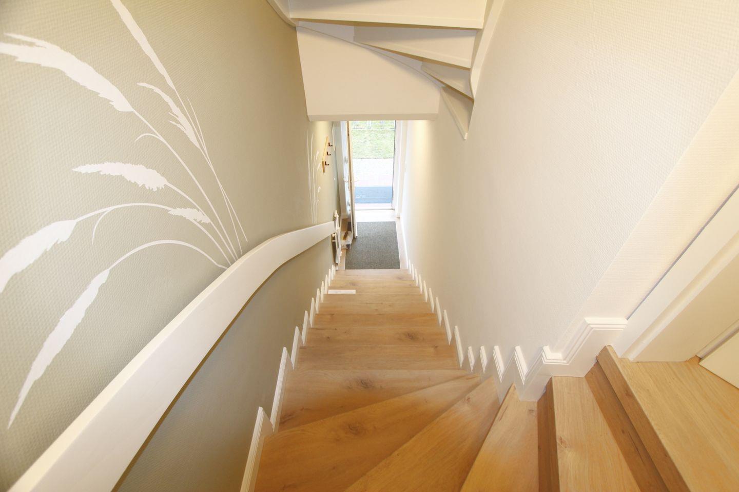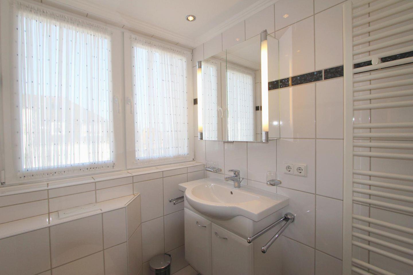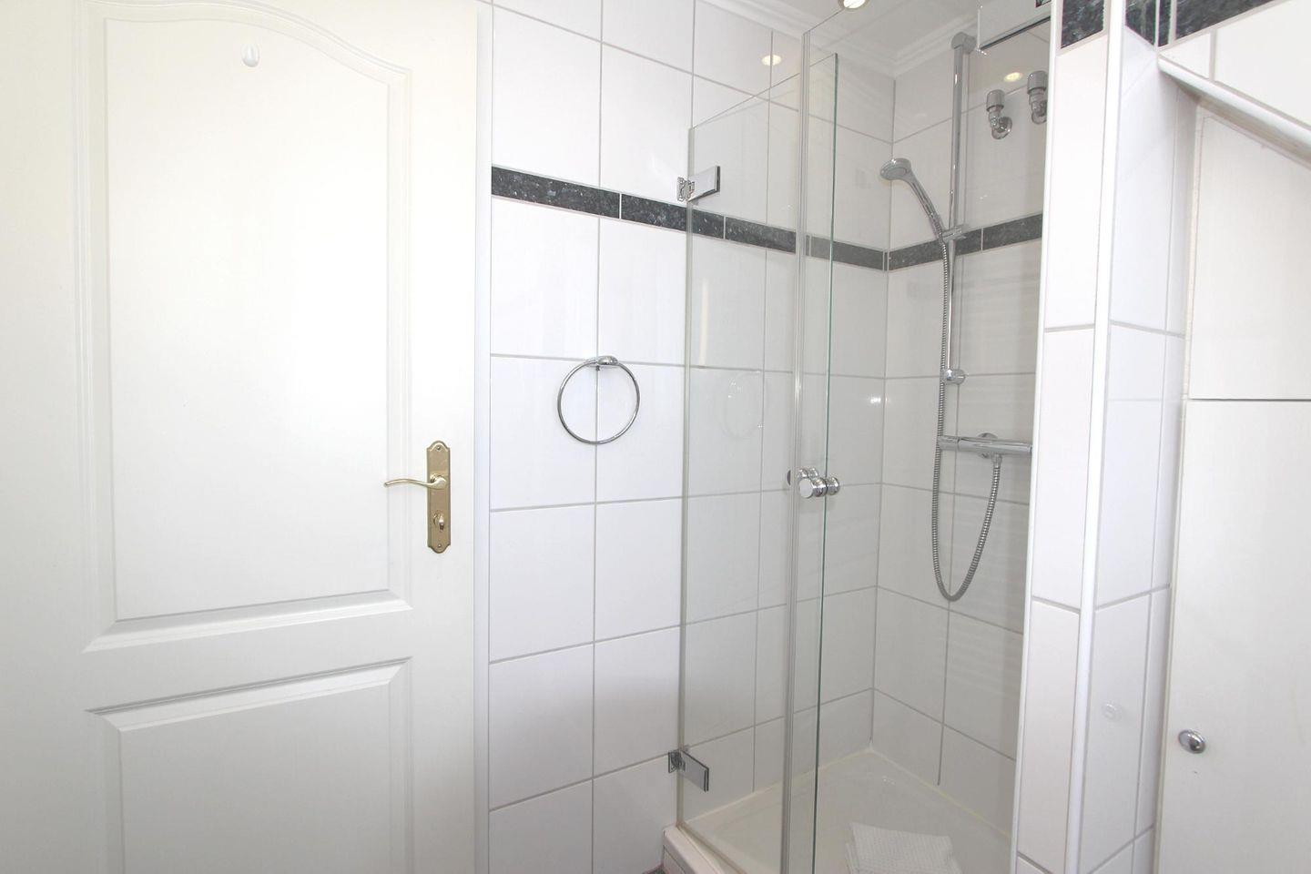 Das helle Badezimmer mit WC und Dusche befindet sich im Obergeschoss des Appartements. Ferner stehen Ihnen eine Sauna, eine Waschmaschine und ein Trockner gegen Gebühr im Nebenhaus zur Verfügung.