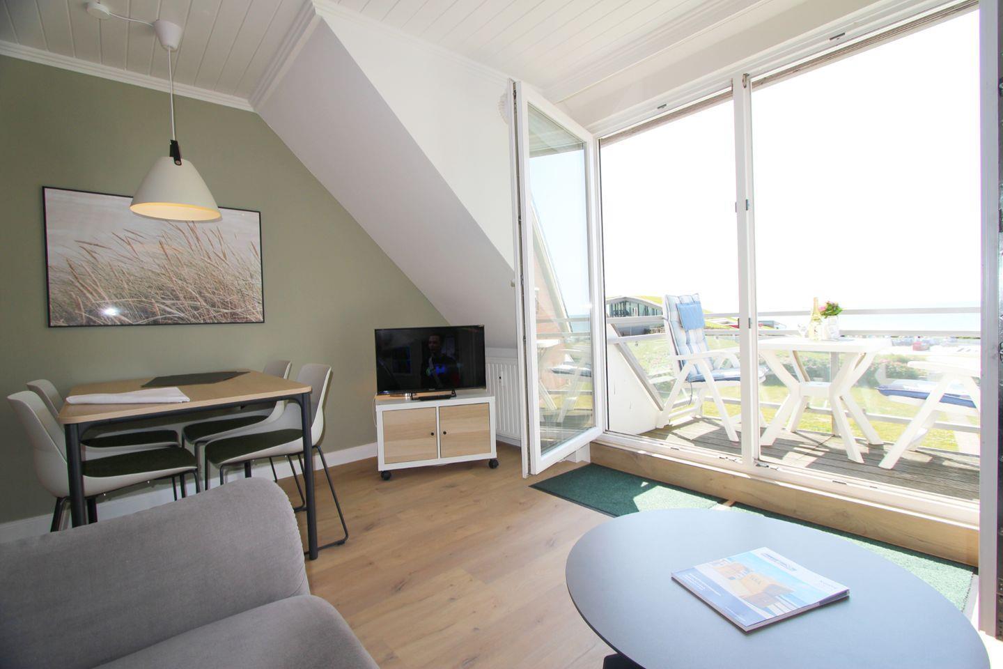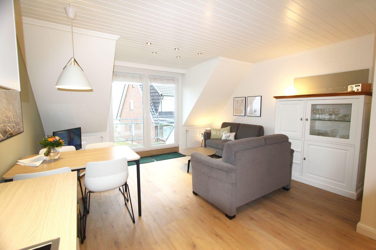 Der hell gestaltete Wohnbereich im Obergeschoss lädt mit einer bequemen Sitzecke zu Entspannung und Erholung ein. Highlight des Wohnbereiches ist der Meerblick!