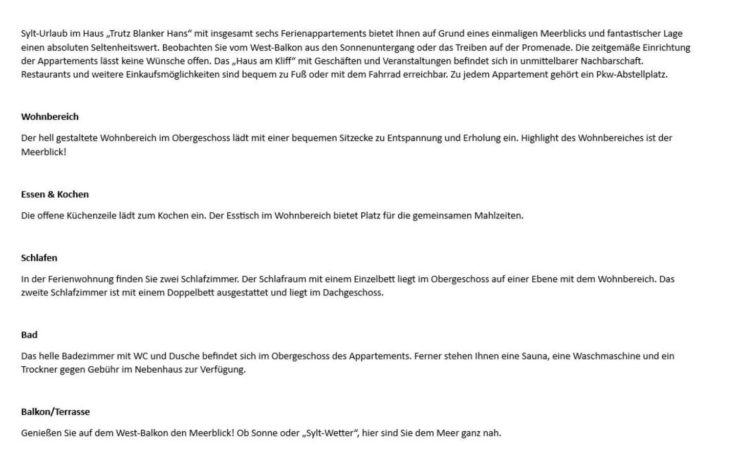 Sylt-Urlaub im Haus „Trutz Blanker Hans“ mit insgesamt sechs Ferienappartements bietet Ihnen auf Grund eines einmaligen Meerblicks und fantastischer Lage einen absoluten Seltenheitswert. Beobachten Sie vom West-Balkon aus den Sonnenuntergang oder das Treiben auf der Promenade. Die zeitgemäße Einrichtung der Appartements lässt keine Wünsche offen. Das „Haus am Kliff“ mit Geschäften und Veranstaltungen befindet sich in unmittelbarer Nachbarschaft. Restaurants und weitere Einkaufsmöglichkeiten sind bequem zu Fuß oder mit dem Fahrrad erreichbar. Zu jedem Appartement gehört ein Pkw-Abstellplatz.