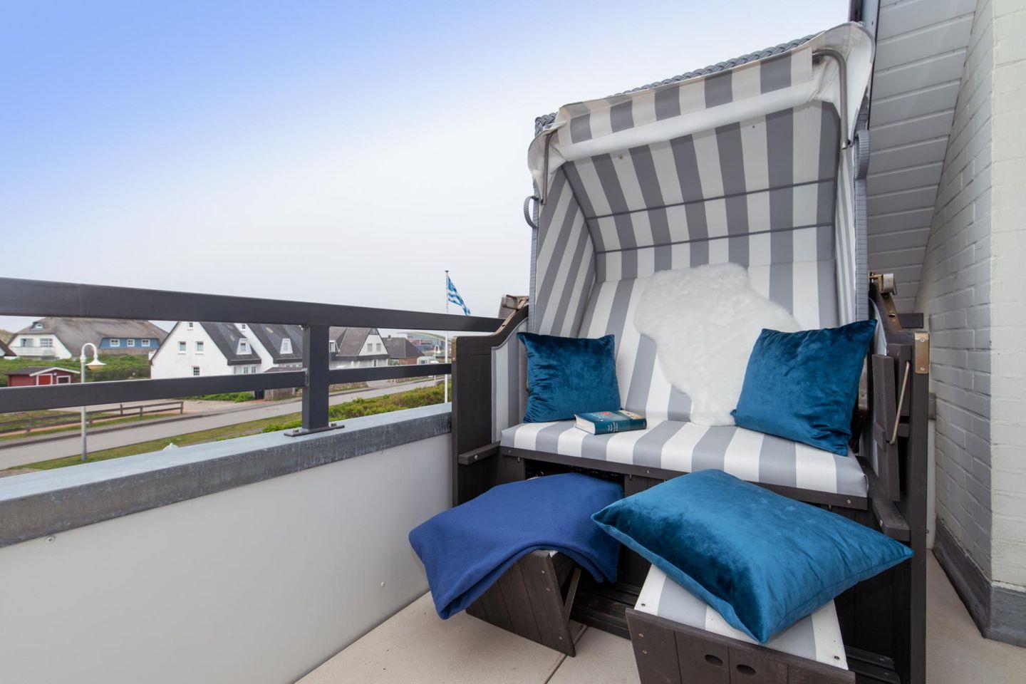 Der volle Rundum-Komfort erwartet Sie draußen: Genießen Sie die frische Nordseeluft und folgen Sie dabei dem Lauf der Sonne! Ihnen stehen an den Wohn- und Essbereich angrenzend ein Süd- und ein Westbalkon (mit Strandkorb) zur Verfügung, die Sie nach Belieben nutzen können.