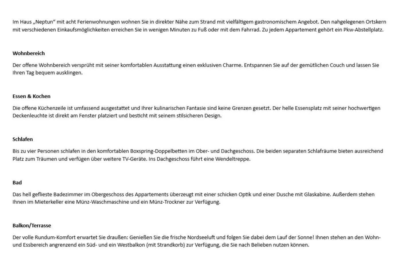 Im Haus „Neptun“ mit acht Ferienwohnungen wohnen Sie in direkter Nähe zum Strand mit vielfältigem gastronomischem Angebot. Den nahgelegenen Ortskern mit verschiedenen Einkaufsmöglichkeiten erreichen Sie in wenigen Minuten zu Fuß oder mit dem Fahrrad. Zu jedem Appartement gehört ein Pkw-Abstellplatz.