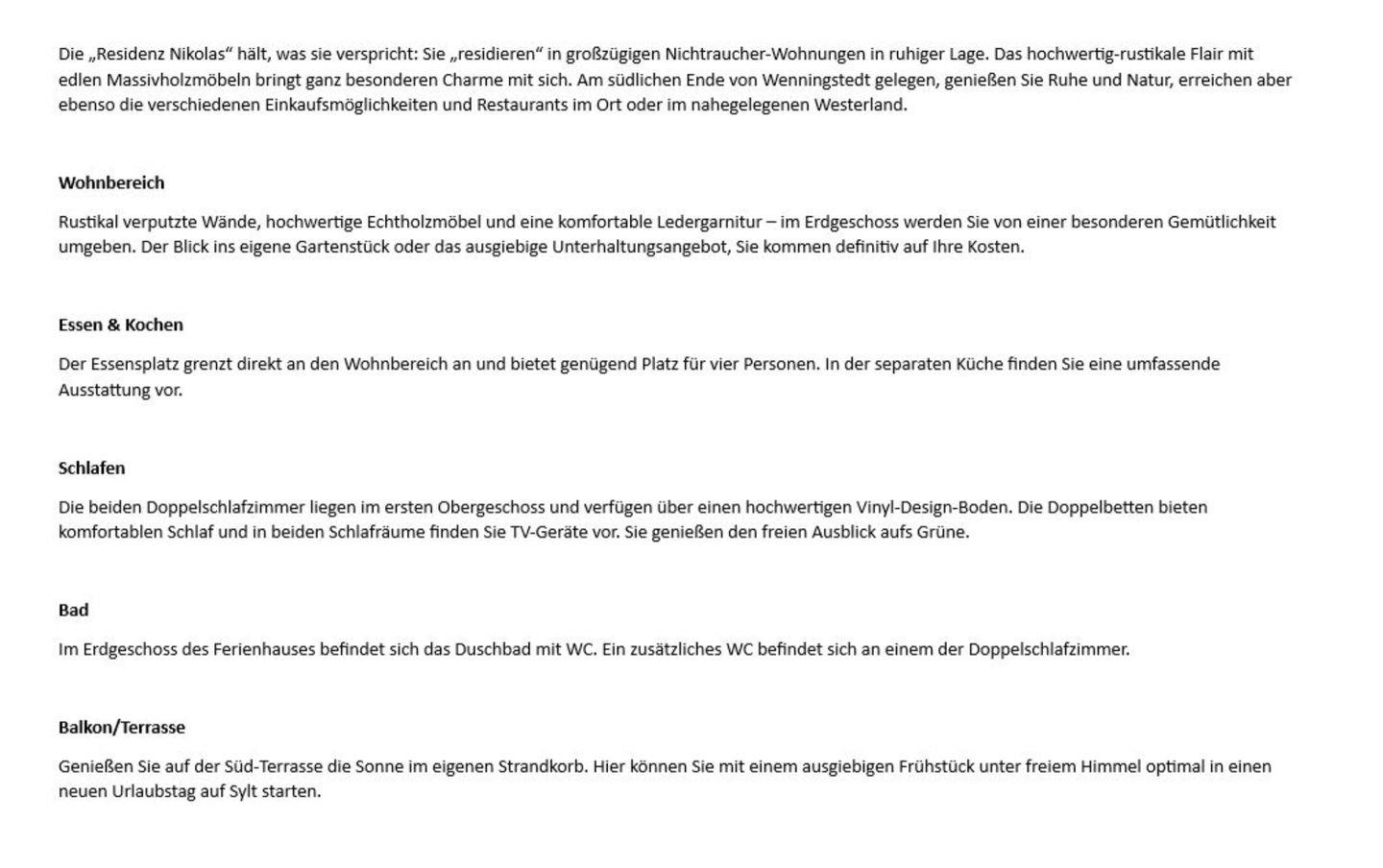 Die „Residenz Nikolas“ hält, was sie verspricht: Sie „residieren“ in großzügigen Nichtraucher-Wohnungen in ruhiger Lage. Das hochwertig-rustikale Flair mit edlen Massivholzmöbeln bringt ganz besonderen Charme mit sich. Am südlichen Ende von Wenningstedt gelegen, genießen Sie Ruhe und Natur, erreichen aber ebenso die verschiedenen Einkaufsmöglichkeiten und Restaurants im Ort oder im nahegelegenen Westerland.