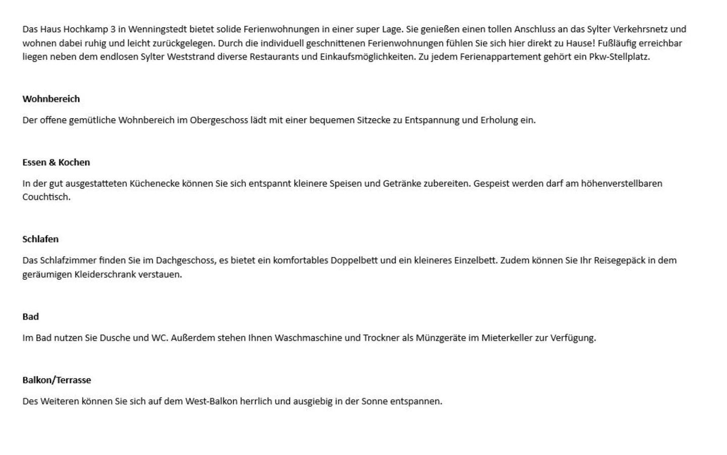 Liebevoll eingerichtetes Ferienappartement im Ober- und Dachgeschoss in einer gepflegten Anlage. Urlauben Sie mit bis zu drei Personen in toller Lage in der Nähe der modernen Promenade in Wenningstedt!