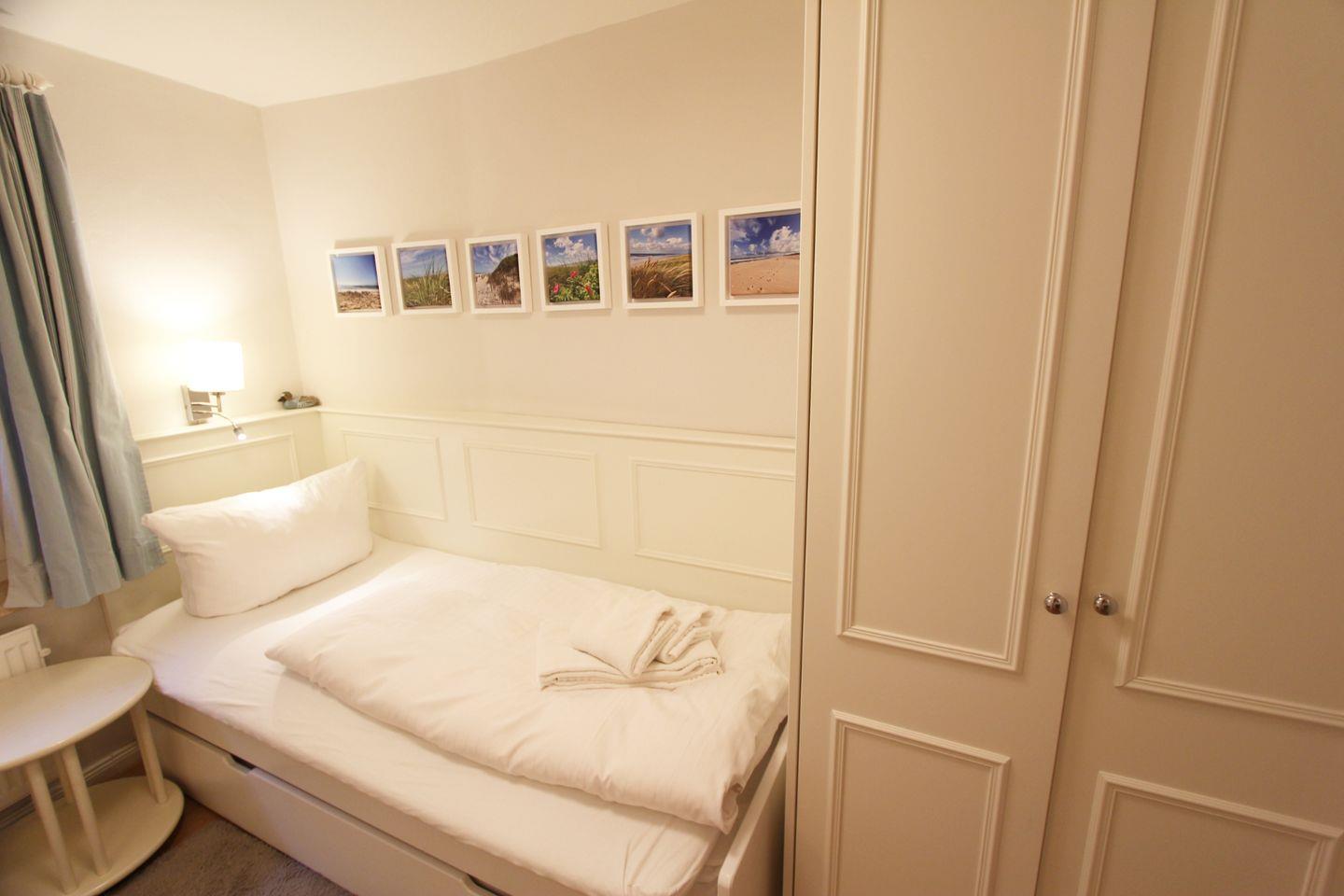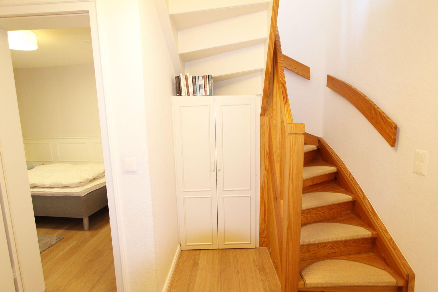 Das Untergeschoss bietet zwei individuell eingerichtete Schlafräume. Im Doppelschlafraum finden Sie ein bequemes Doppelbett mit geräumigem Kleiderschrank vor. Der Einzelschlafraum ist im Stile des Wohnraums hell und nordisch gestaltet.