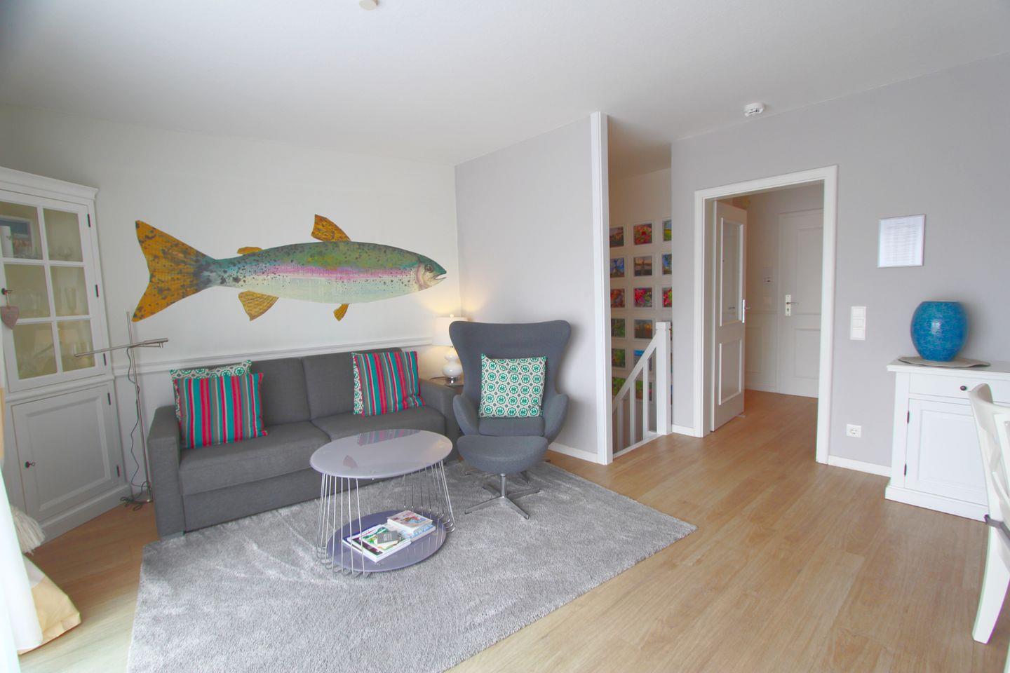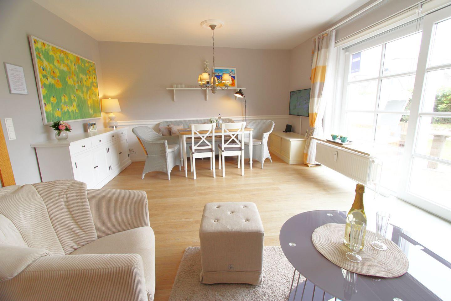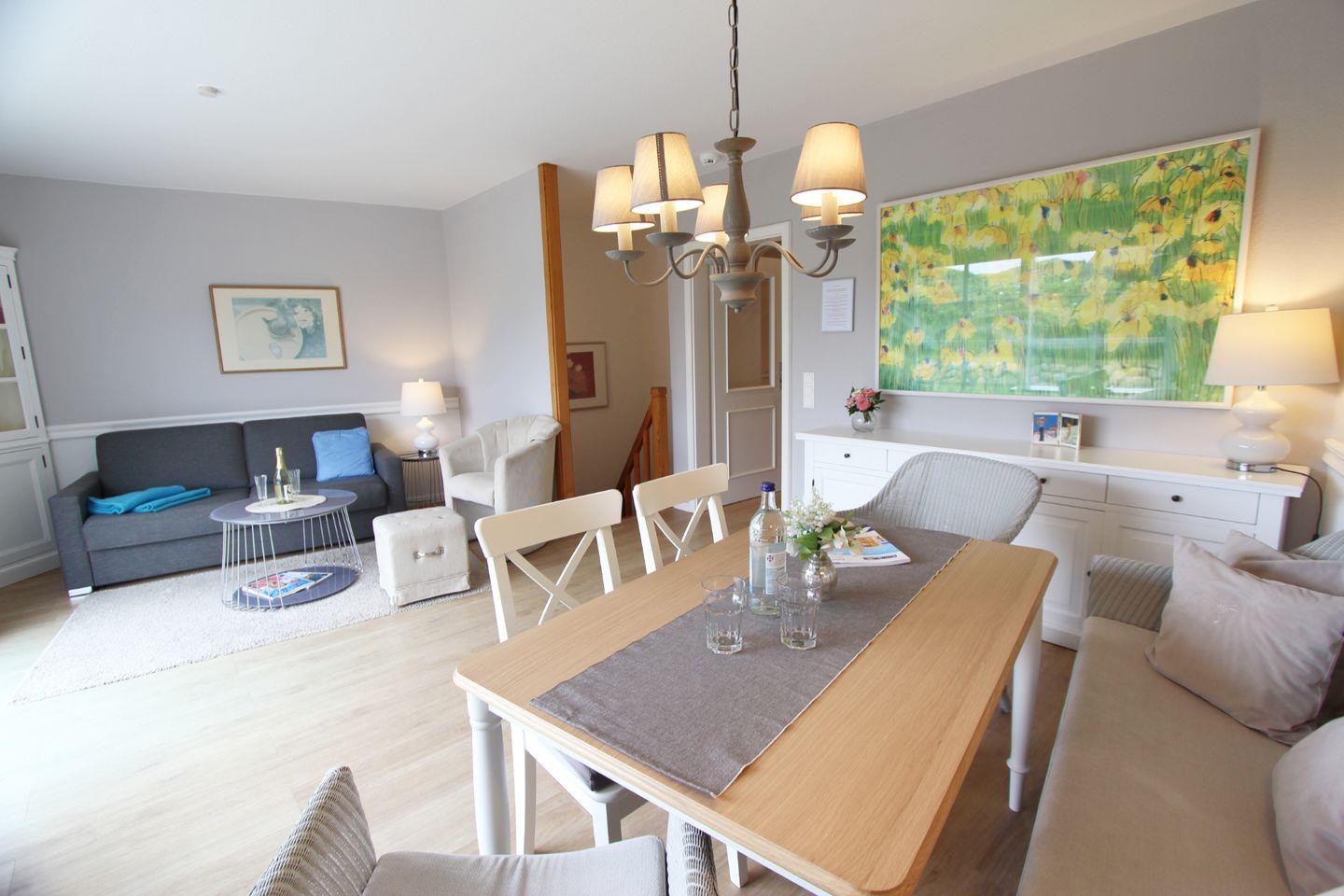 Ein besonderes Ambiente versprüht der edel eingerichtete Wohnraum im Erdgeschoss. Hier finden Sie eine bequeme Couch, alles ist in hellen und hochwertigen Farben gehalten, sodass Sie sich hier direkt wohl fühlen werden.