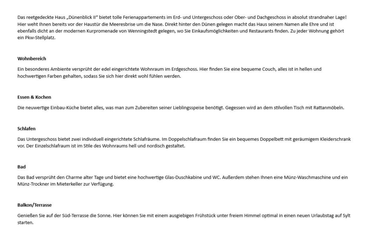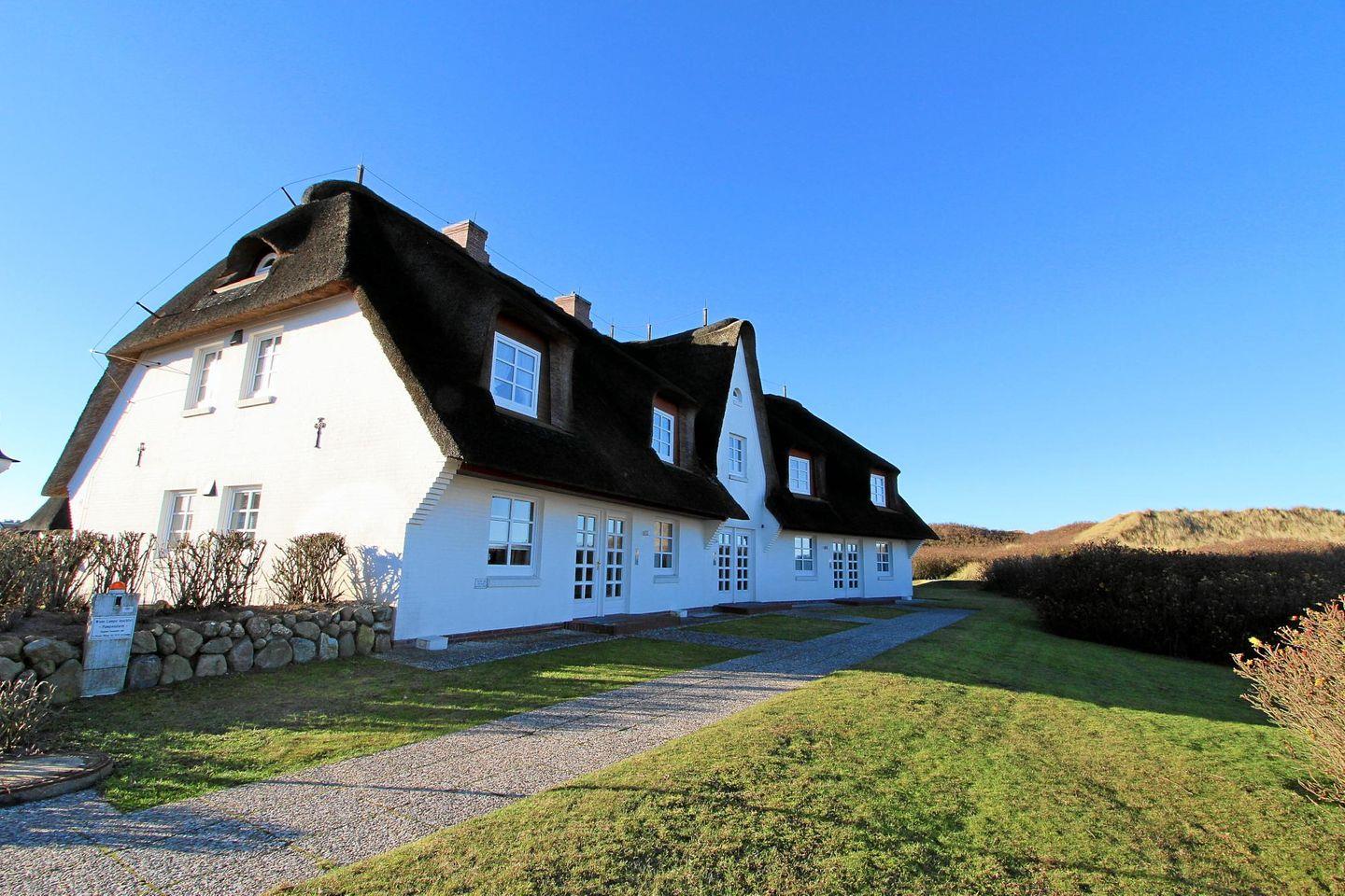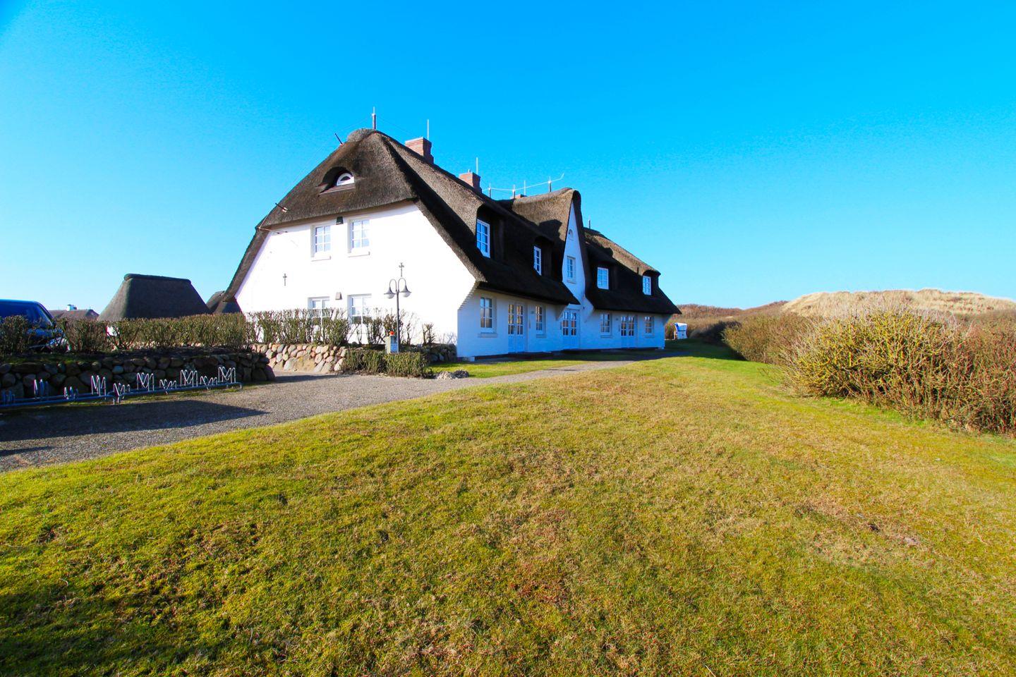 Das reetgedeckte Haus „Dünenblick II“ bietet tolle Ferienappartements im Erd- und Untergeschoss oder Ober- und Dachgeschoss in absolut strandnaher Lage! Hier weht Ihnen bereits vor der Haustür die Meeresbrise um die Nase. Direkt hinter den Dünen gelegen macht das Haus seinem Namen alle Ehre und ist ebenfalls dicht an der modernen Kurpromenade von Wenningstedt gelegen, wo Sie Einkaufsmöglichkeiten und Restaurants finden. Zu jeder Wohnung gehört ein Pkw-Stellplatz.