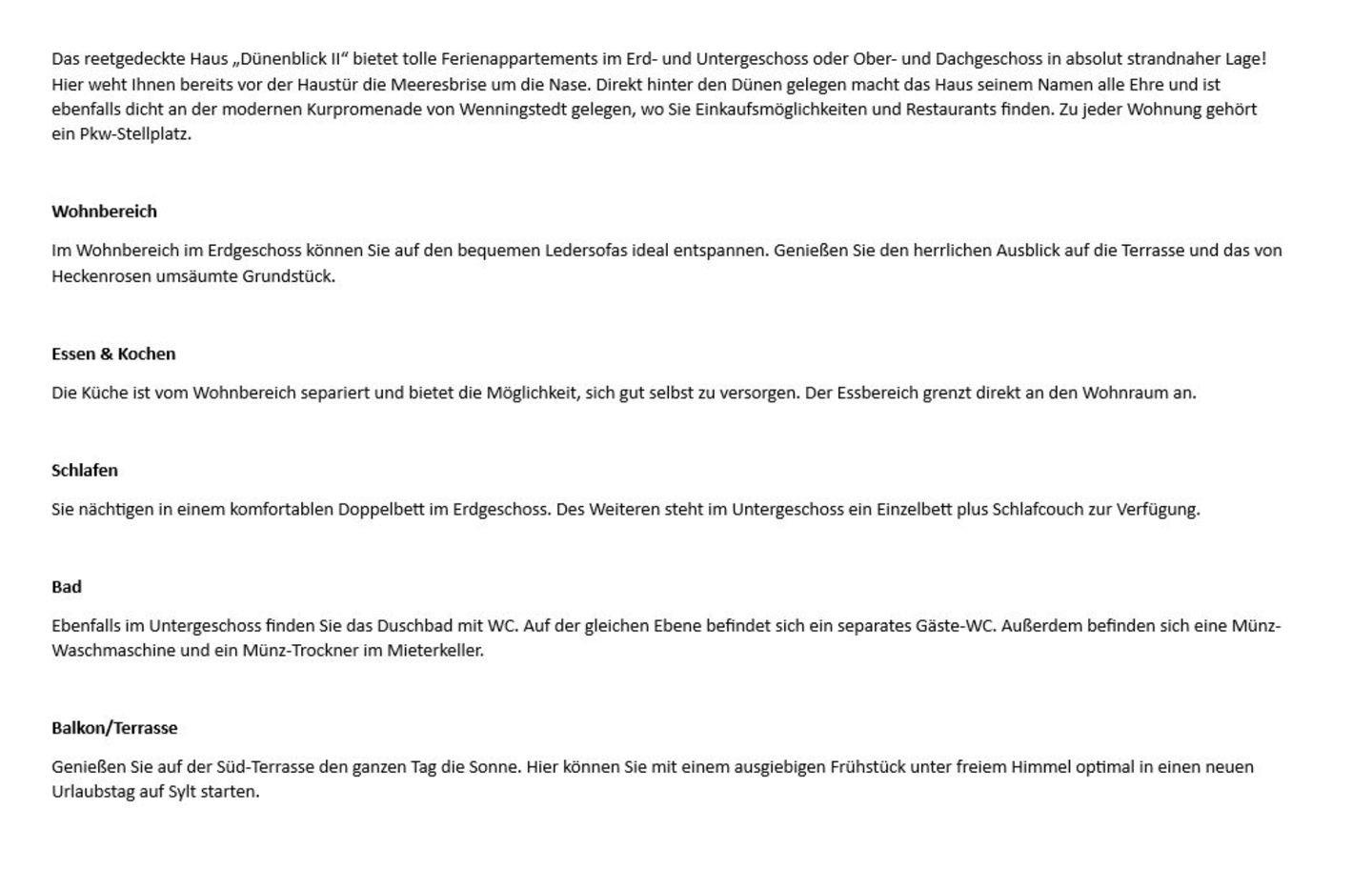 Das reetgedeckte Haus „Dünenblick II“ bietet tolle Ferienappartements im Erd- und Untergeschoss oder Ober- und Dachgeschoss in absolut strandnaher Lage! Hier weht Ihnen bereits vor der Haustür die Meeresbrise um die Nase. Direkt hinter den Dünen gelegen macht das Haus seinem Namen alle Ehre und ist ebenfalls dicht an der modernen Kurpromenade von Wenningstedt gelegen, wo Sie Einkaufsmöglichkeiten und Restaurants finden. Zu jeder Wohnung gehört ein Pkw-Stellplatz.