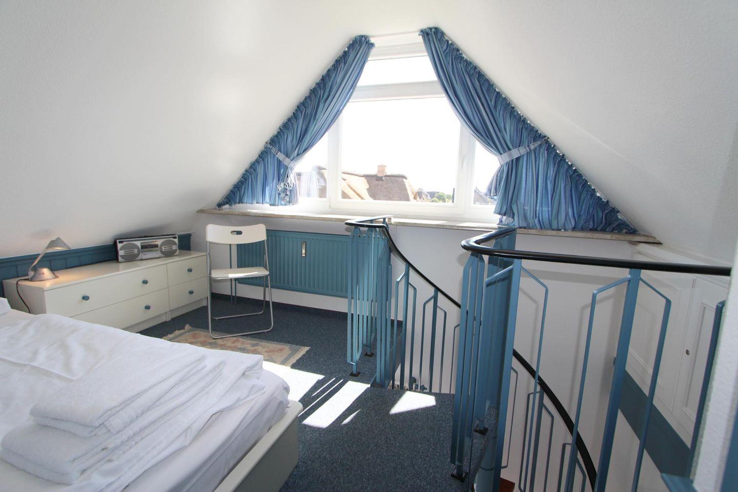 Den Schlafraum im Dachgeschoss erreichen Sie über eine steile Wendeltreppe. Oben angekommen erwartet Sie ein gemütliches Doppelbett. Der Raum ist in tollem friesischem Blau gestaltet und versprüht einen nordischen Charme.