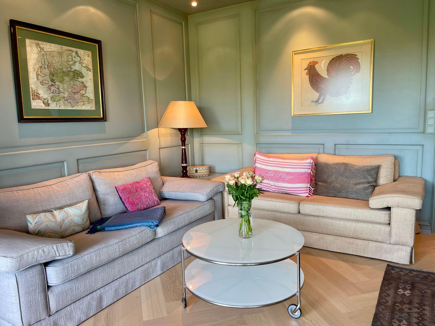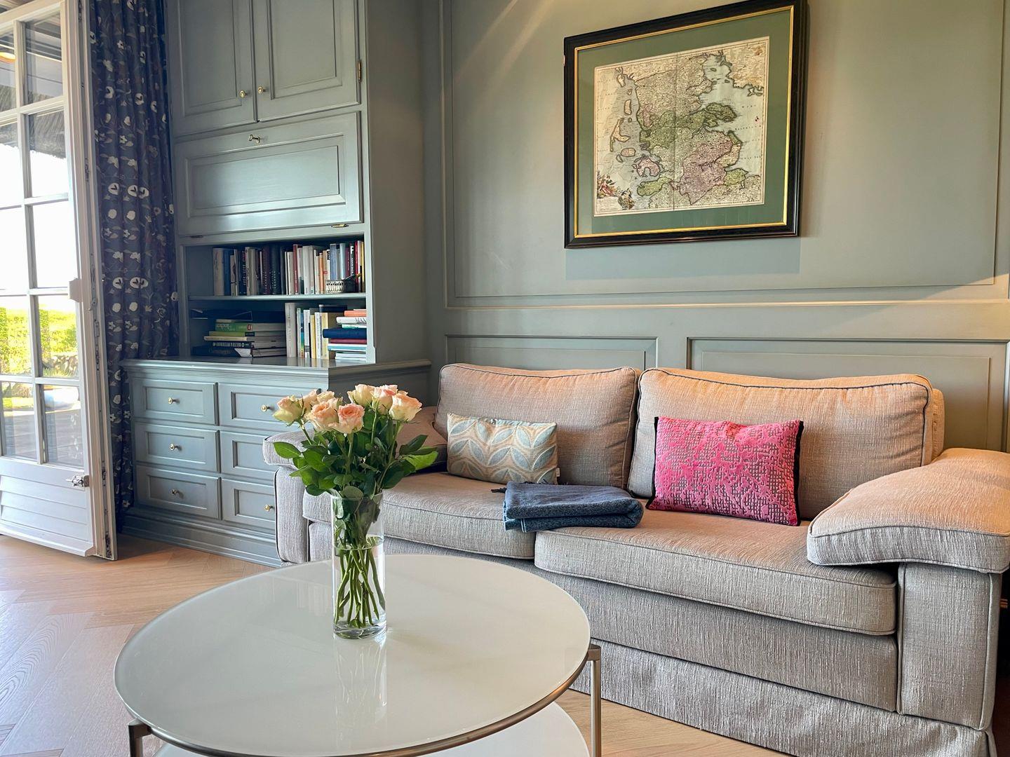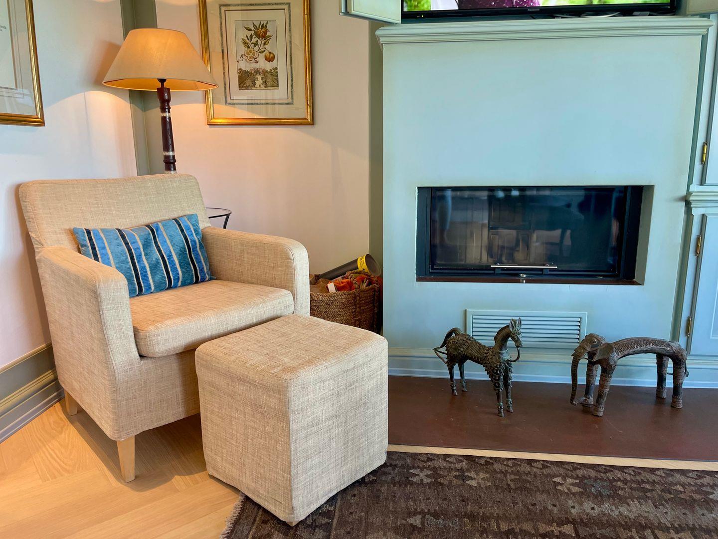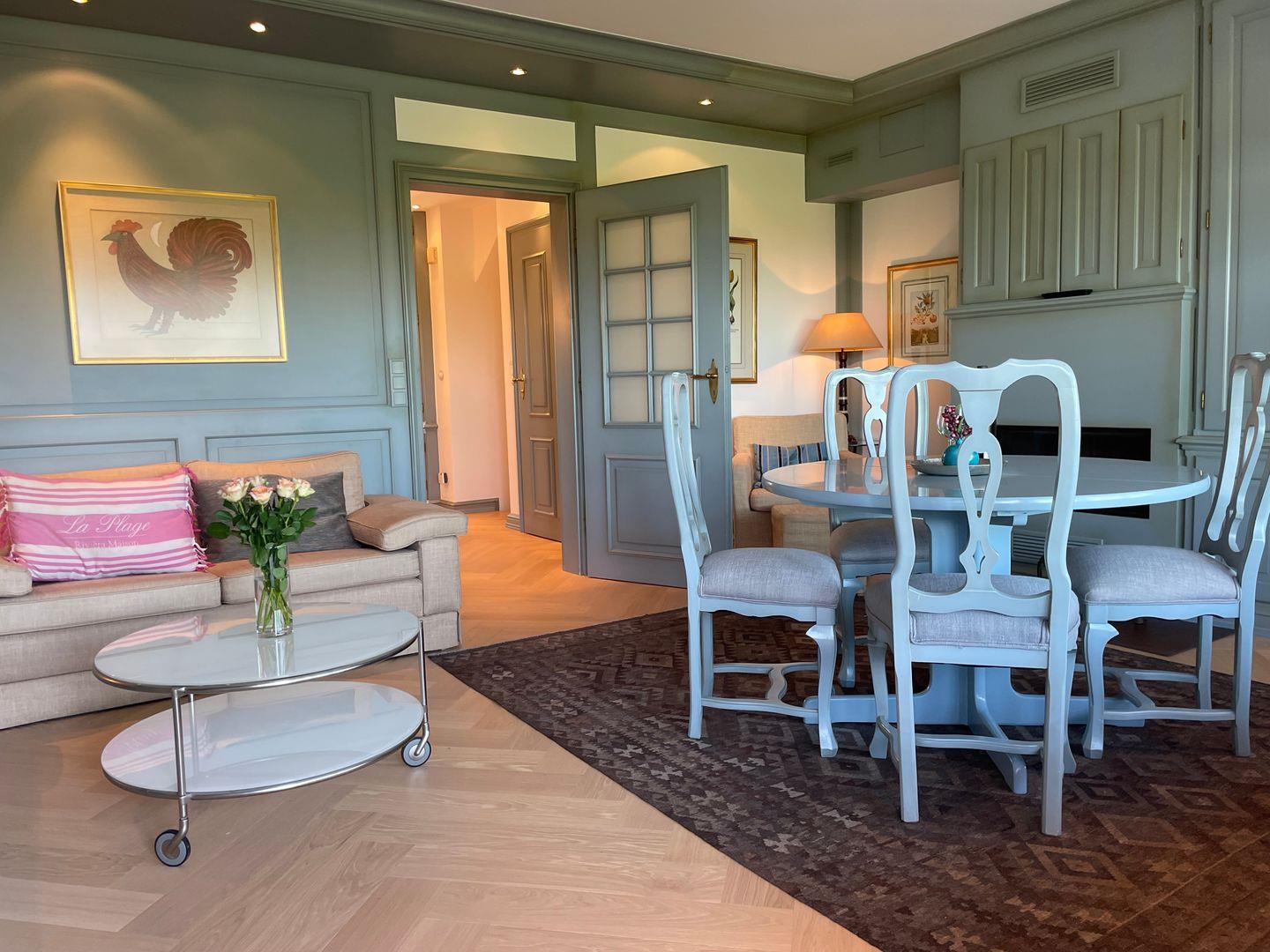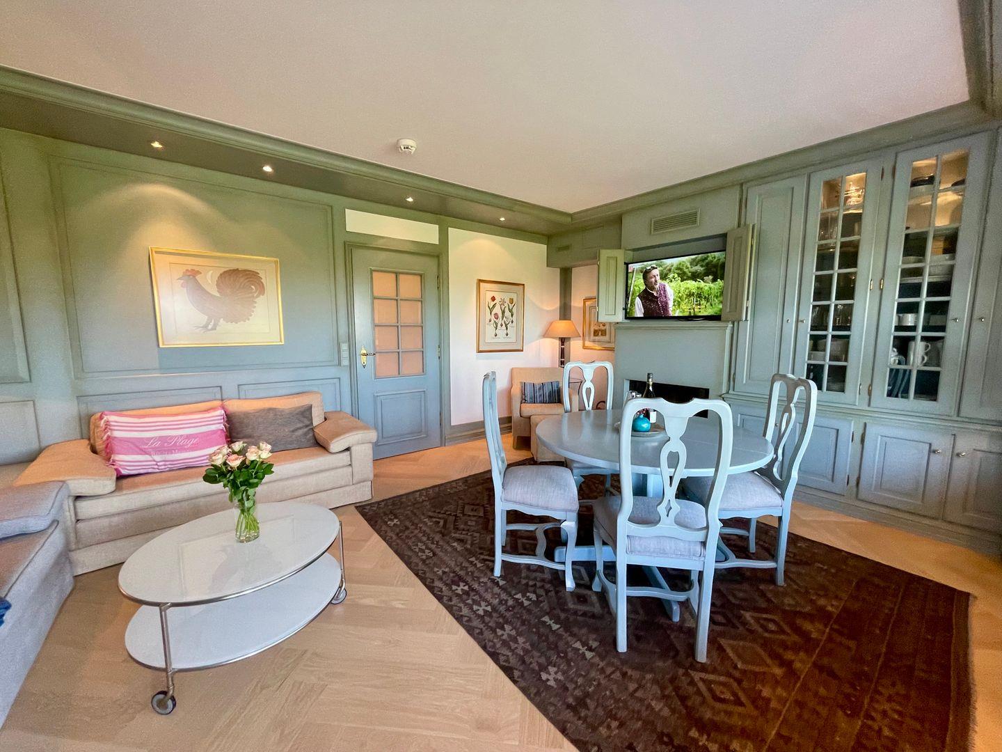 Das geschmackvoll eingerichtete Hausteil erstreckt sich über rund 100 Quadratmeter und verteilt sich auf das Erdgeschoss sowie das Untergeschoss. Herzstück ist der offen gestaltete Wohnbereich mit schöner Aussicht und direktem Zugang zur Terrasse. Besonders in den kühleren Monaten sorgt der Kamin für eine wohlig-warme Atmosphäre. Bequeme Polstermöbel, ein großer Esstisch für gemeinsame Mahlzeiten und ein dezent integrierter Fernseher machen den Raum zu einem Ort, an dem man sich sofort zuhause fühlt.