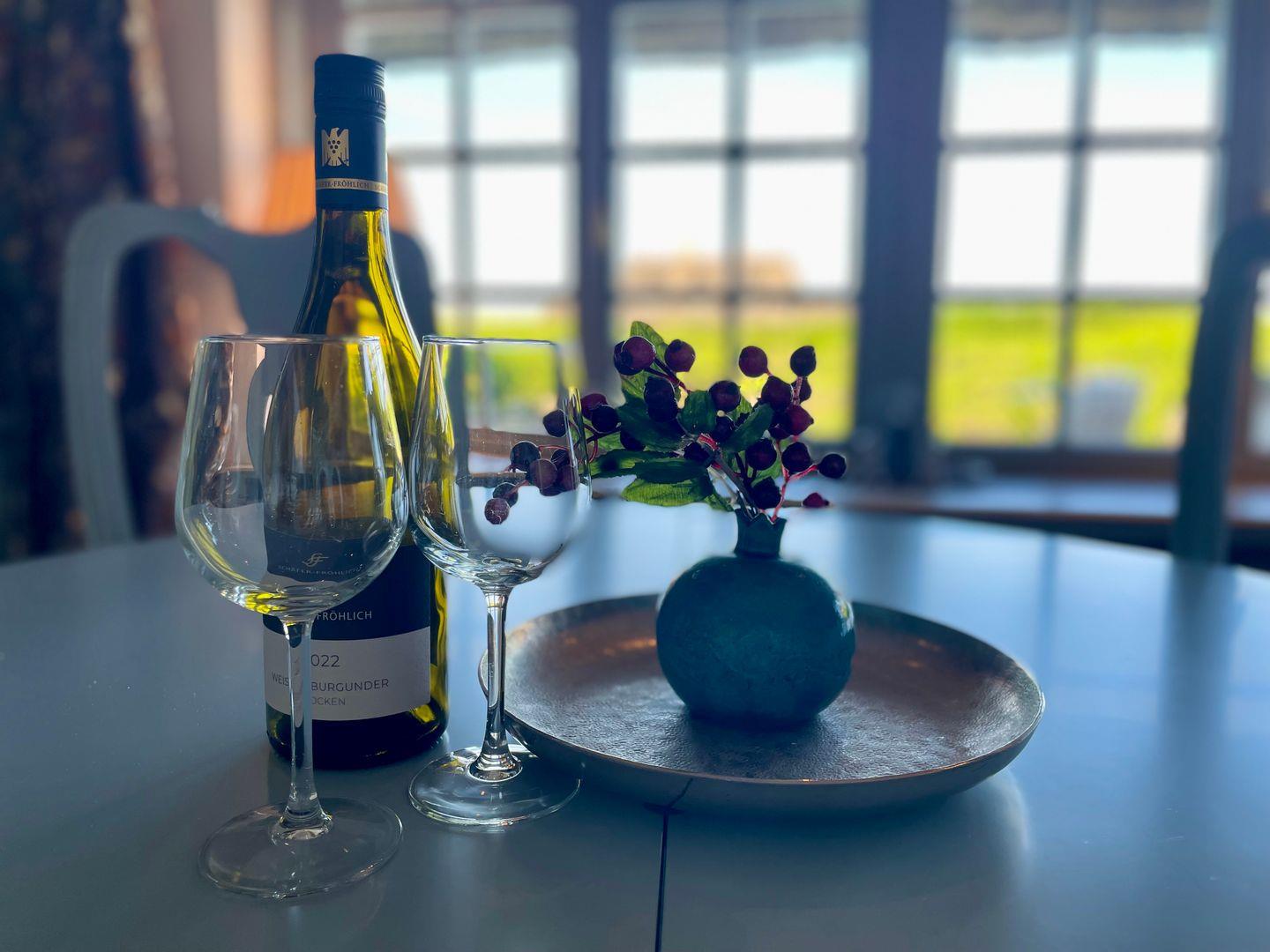 Zur Unterkunft gehört außerdem eine großzügige Terrasse, die zum Verweilen im Freien einlädt. Genießen Sie hier den Blick und die frische Nordseeluft – sei es beim Frühstück am Tisch oder entspannt im typischen Strandkorb. Dieser bietet an lauen Sommerabenden ebenso Gemütlichkeit wie an kühleren Tagen einen geschützten Platz zum Zurücklehnen und Durchatmen.