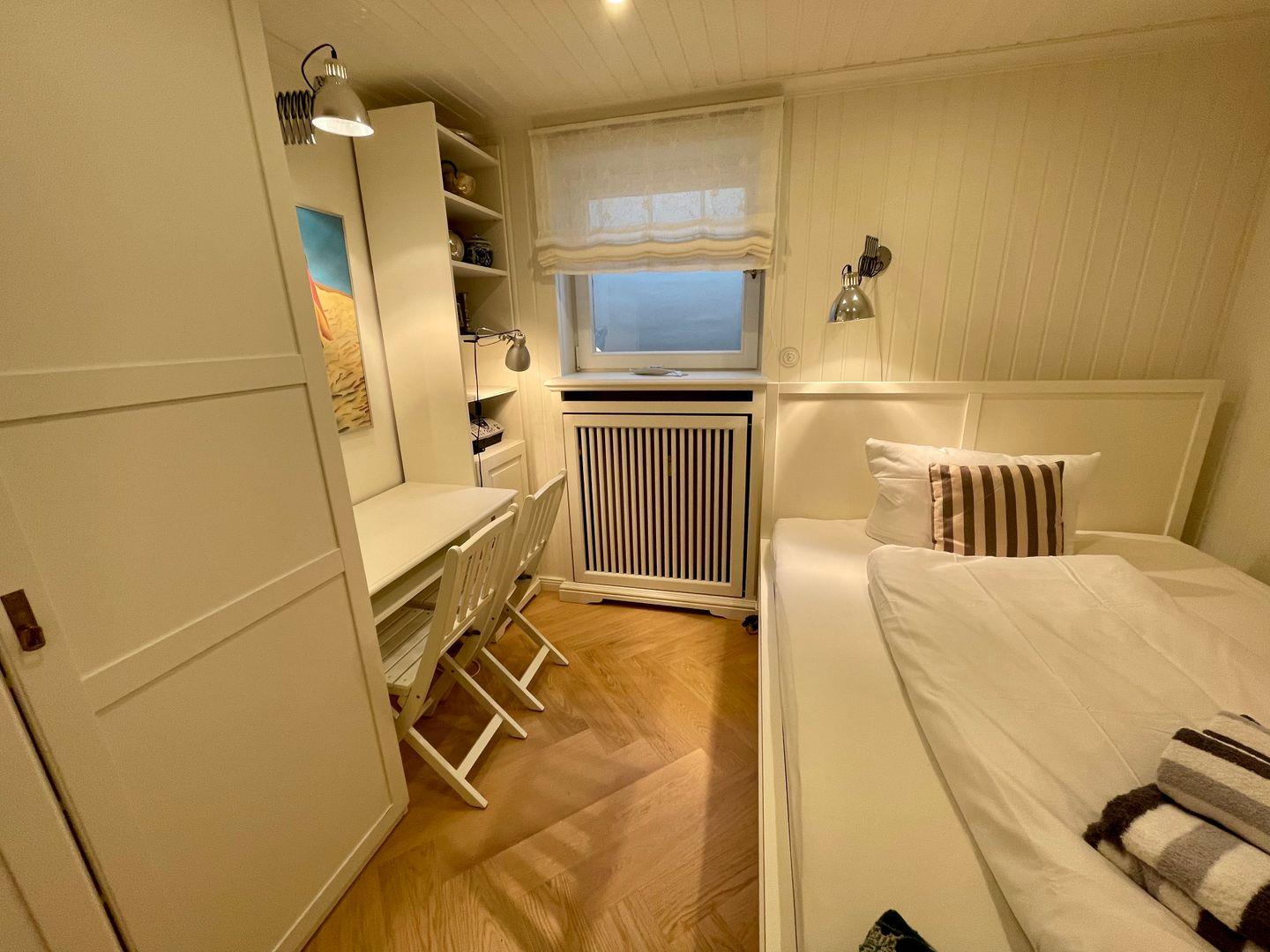 Im Erdgeschoss befindet sich zudem ein gemütliches Schlafzimmer mit einem Doppelbett (140 cm Breite). Der Raum ist angenehm ruhig, mit Kleiderschrank und Sitzgelegenheit ausgestattet und eignet sich hervorragend für erholsame Nächte.
