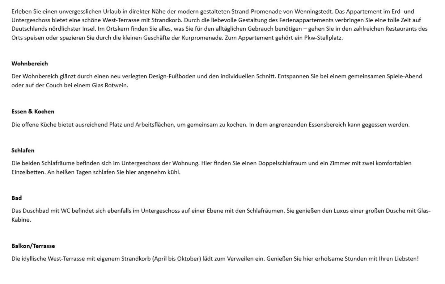 Gemütlich eingerichtetes Ferienappartement im Erd- und Untergeschoss eines gepflegten Hauses in Wenningstedt. Genießen Sie erholsame Tage an der Nordsee und urlauben Sie in dieser wunderbar gelegenen Wohnung. Ideal geeignet für einen Urlaub mit Freunden oder der Familie.