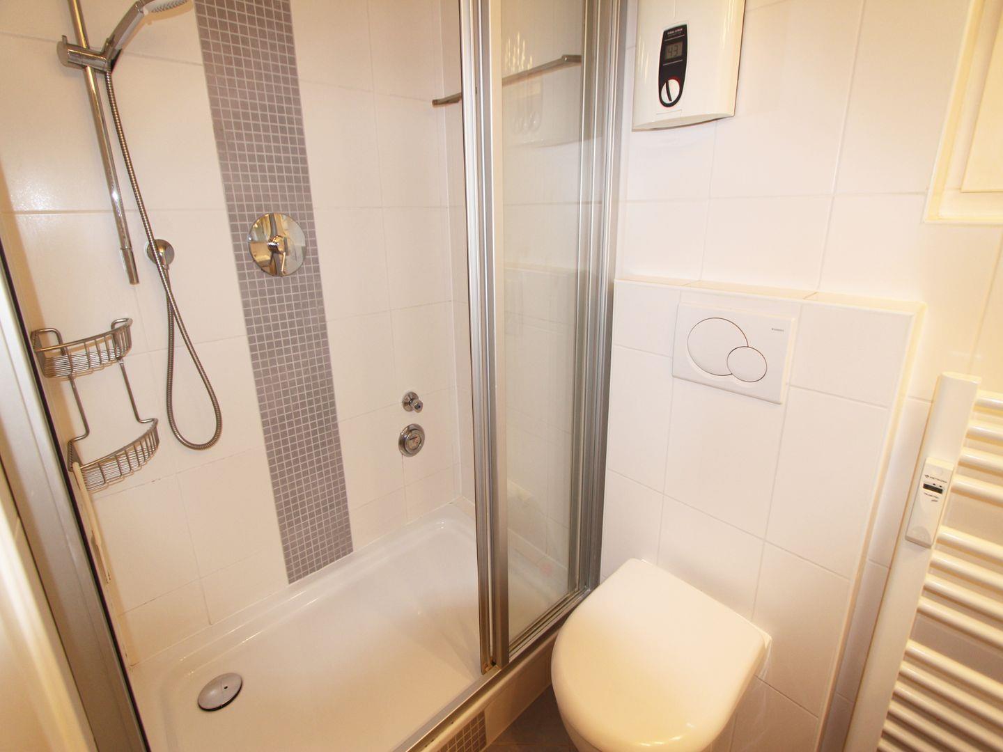 Das Duschbad mit WC befindet sich ebenfalls im Untergeschoss auf einer Ebene mit den Schlafräumen. Sie genießen den Luxus einer großen Dusche mit Glas-Kabine.