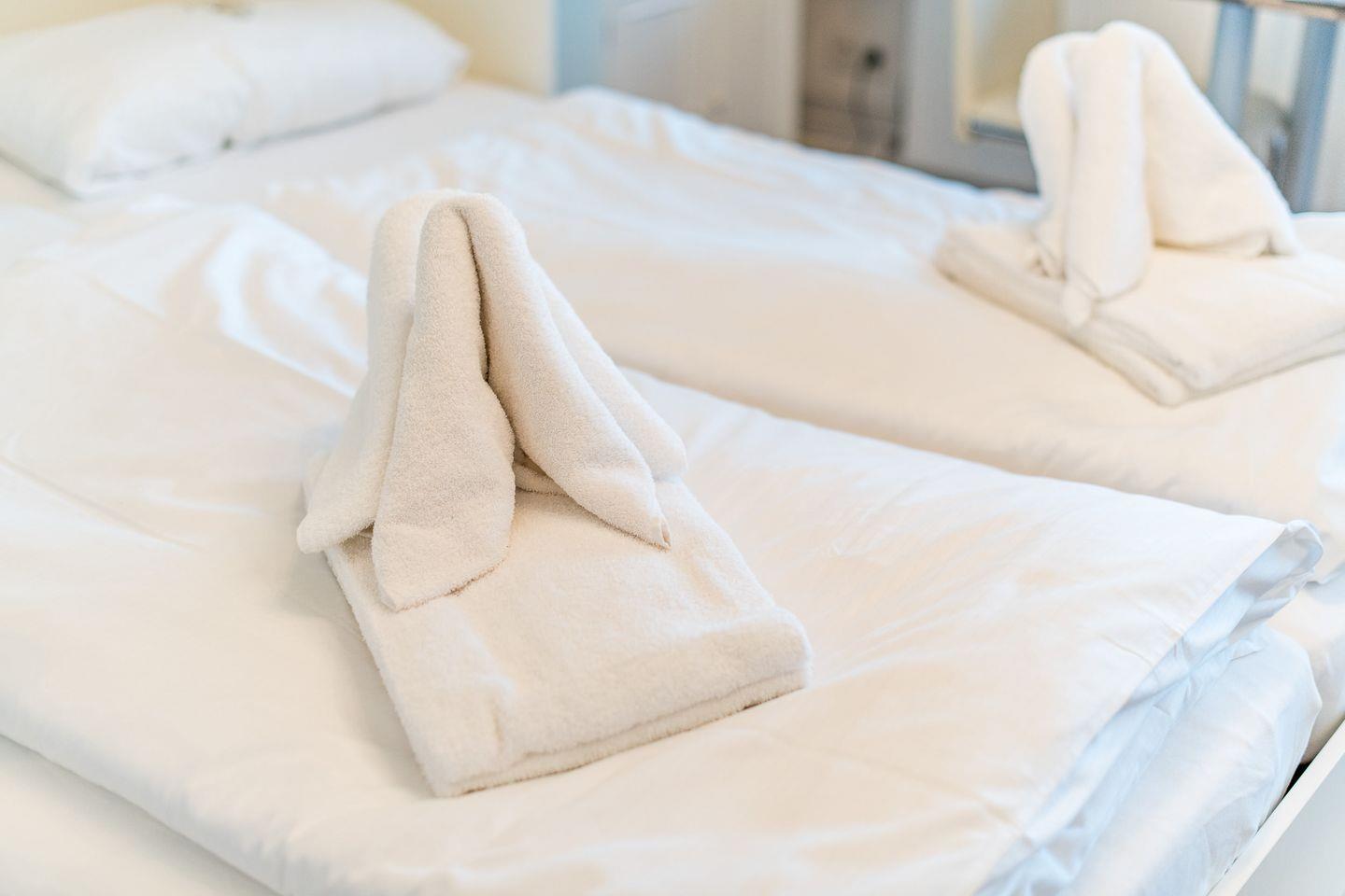 Der Wohn-/Schlafbereich ist mit einem komfortablen Schrankbett (160x200 cm) ausgestattet, das tagsüber dezent verstaut werden kann, um den Raum optimal zu nutzen. Ein TV sorgt für Unterhaltung, und die gemütliche Essecke mit zwei Stühlen bietet Platz für gemeinsame Mahlzeiten. Der direkte Zugang zum möblierten Ostbalkon lädt dazu ein, die Morgensonne zu genießen und frische Meeresluft zu tanken.